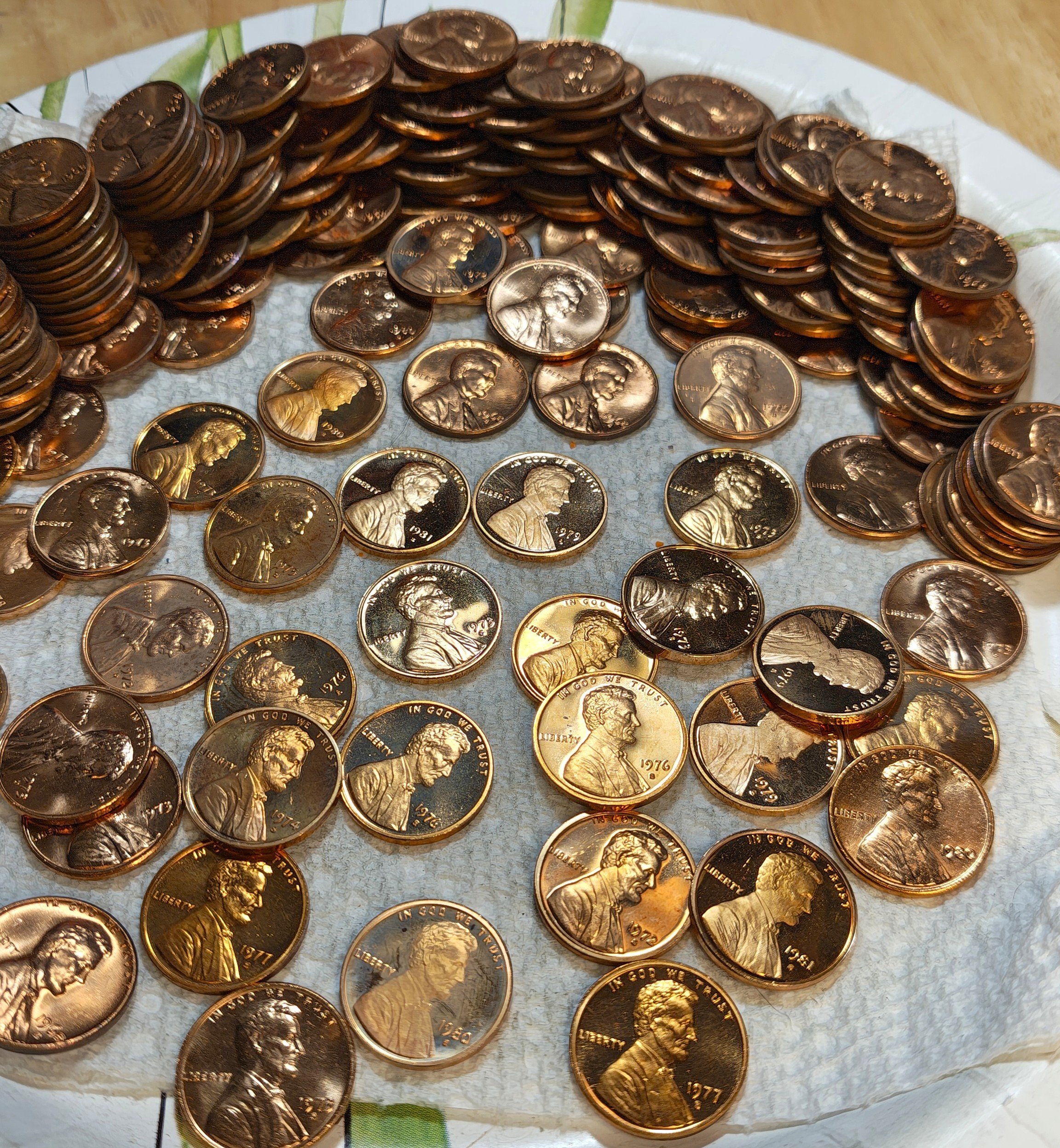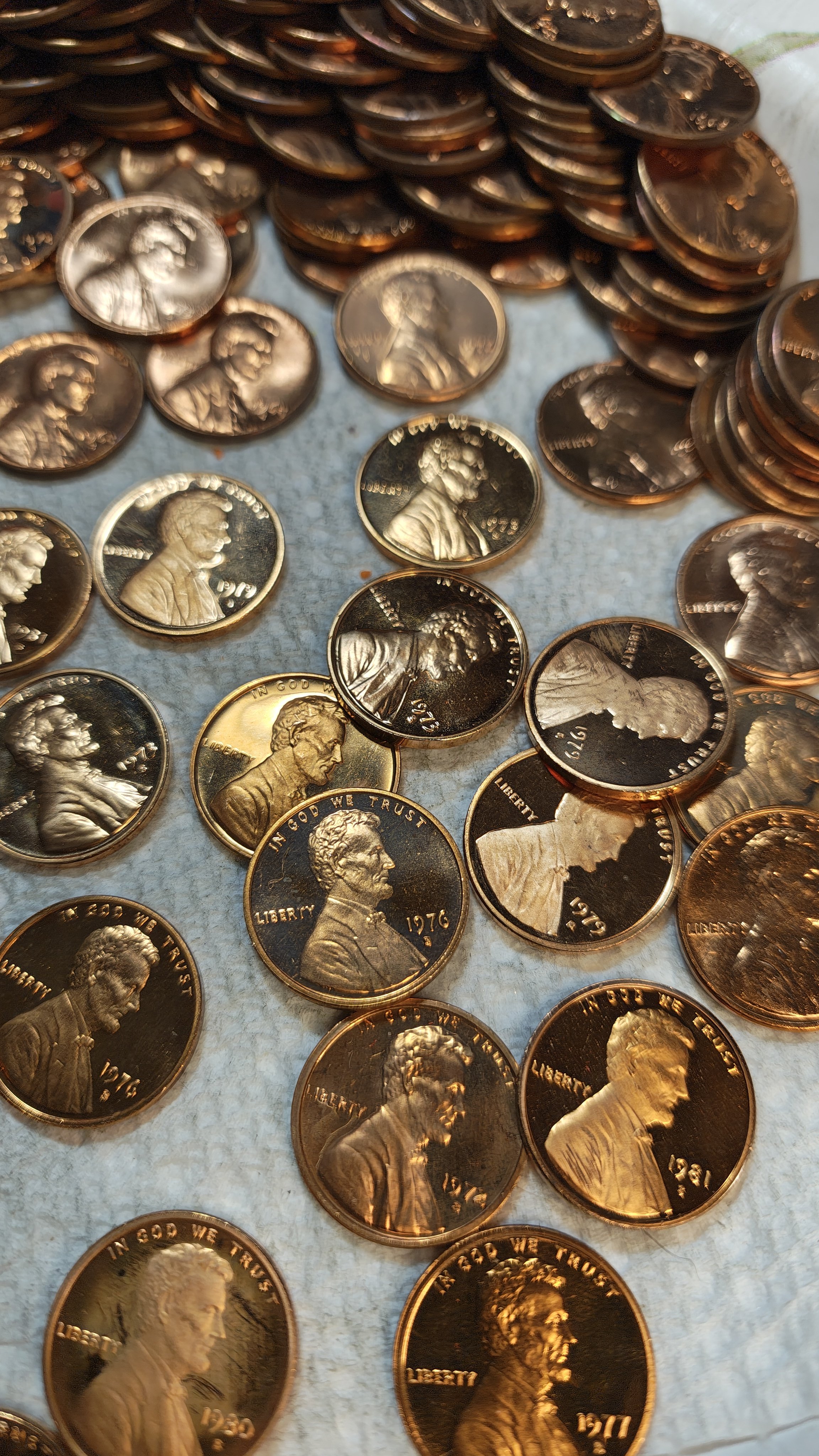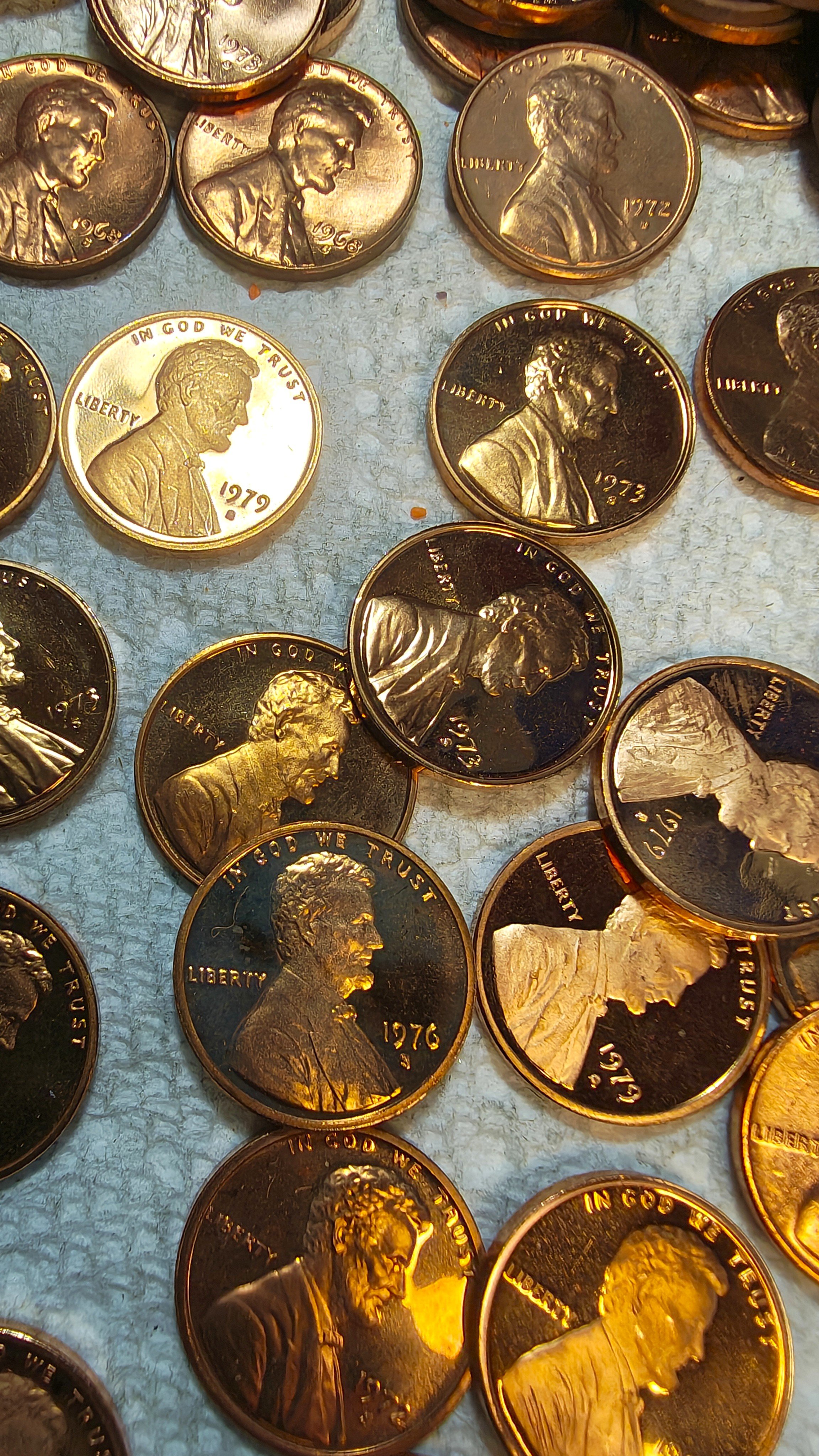 Anyways... I open one box and it has probably 10,000 or so pennies in it. Mostly wheats, but there are these incredibly shiny pennies scattered throughout. Initially, I figured someone busted off a few rolls of recent years.