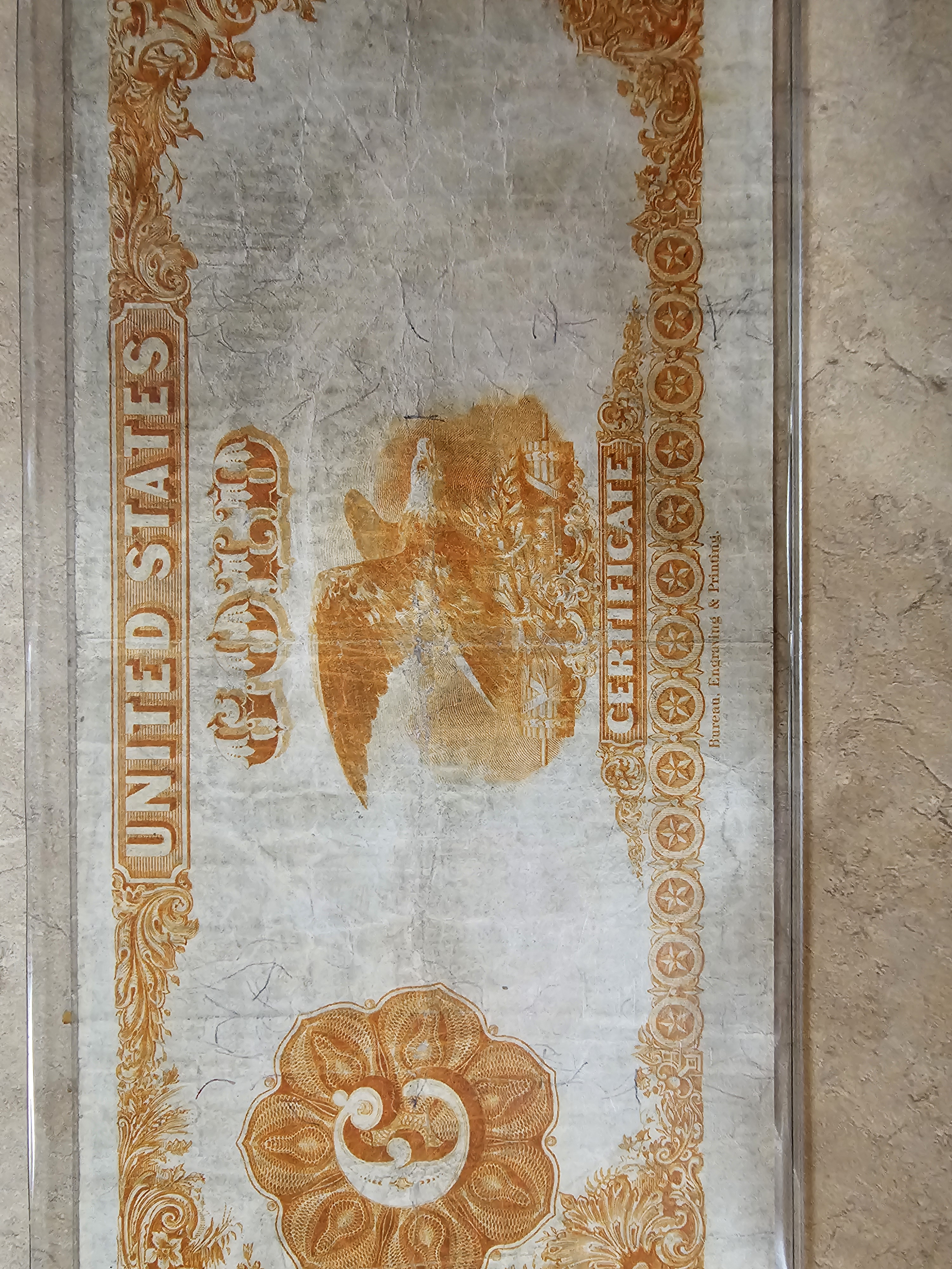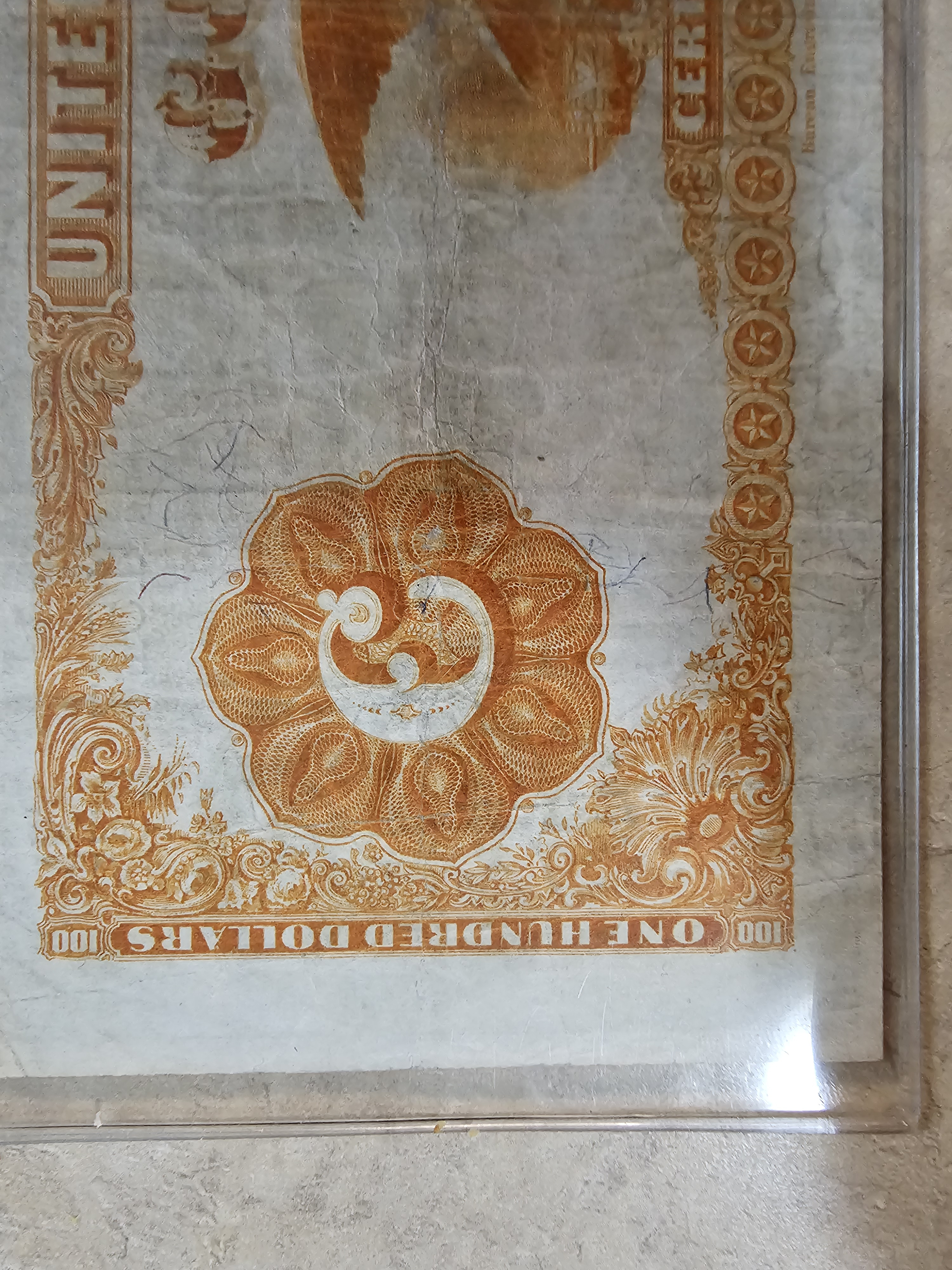 I see a heavily circulated (wrinkled) note which looks unnaturally clean. To me, it looks like it was washed (or processed) to minimize both soiling & the extensive network of creases/folds were pressed. There's many darkened fields which show that the paper has been damaged/soiled (but later washed/doctored).