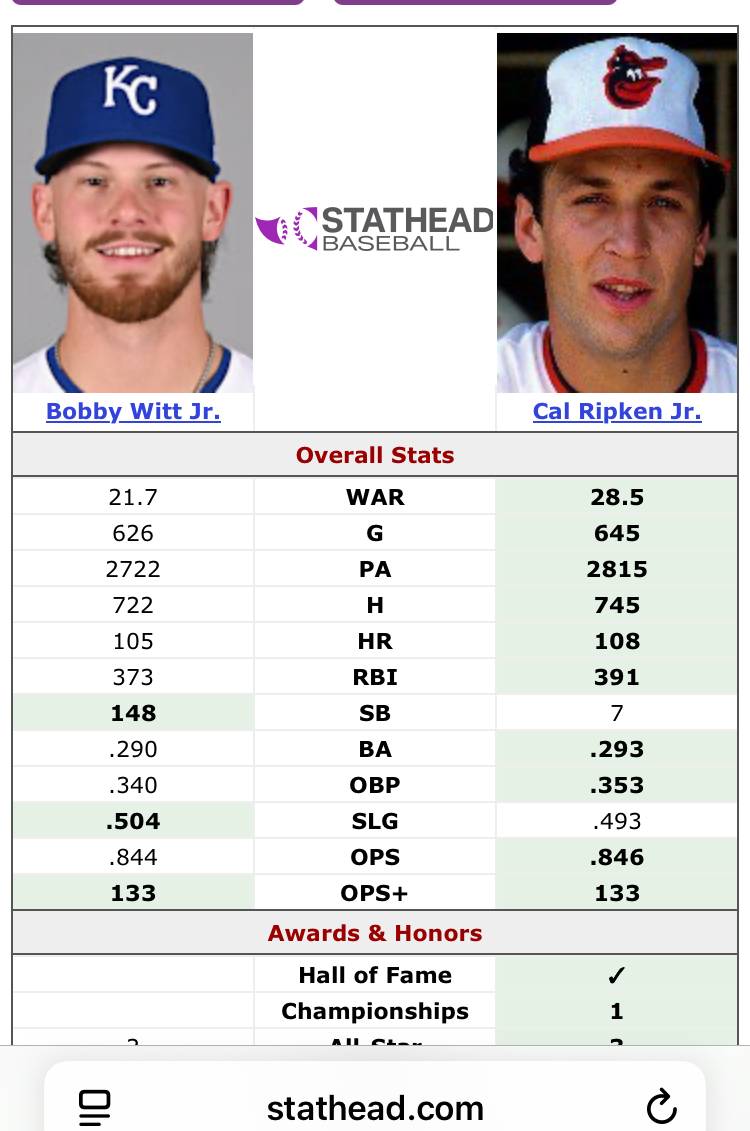 Witt is a fantastic player. The Royals scored huge when they got him. I think the only thing that could keep him from topping Cal is if the second half of his career turns into Mike Trouts second half.