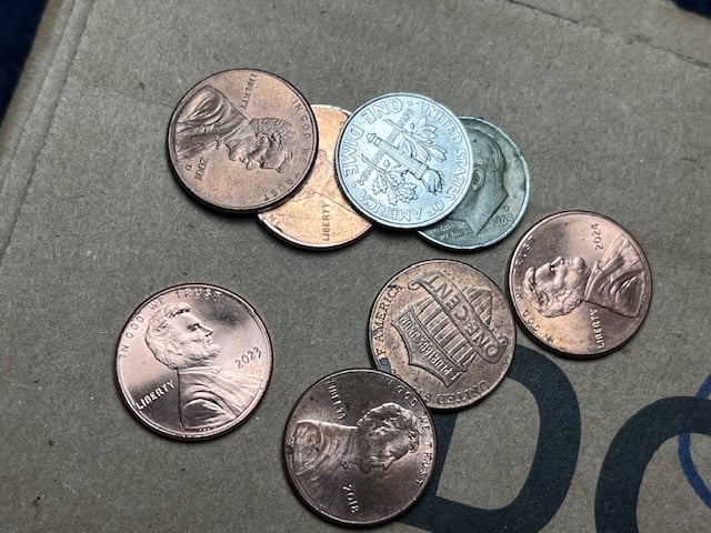 The 57 dime was on the ground in front of the machine and the 29 Wheatie was in the return. Both are from Philly.