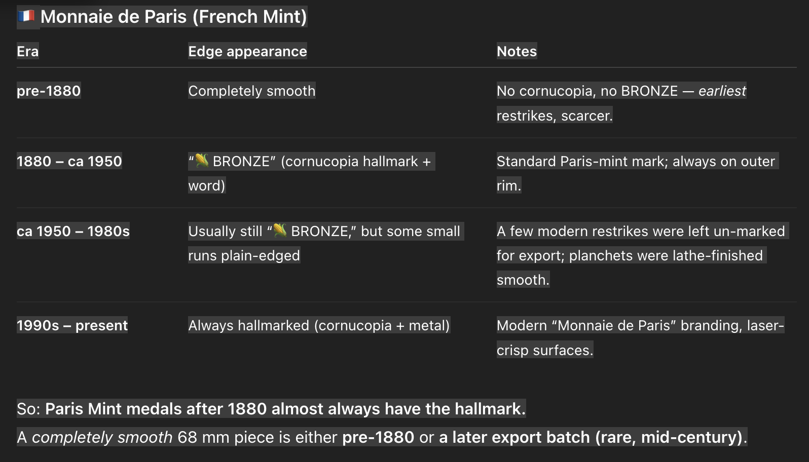 And told me all the U.S. Mint strikes were 76mm. I also questioned it profusely over the sharpness of what appeared to be a modern strike and bright yellow bronze and it offered (paraphrased) 'Paris mint rocks, all their stuff looked modern'.