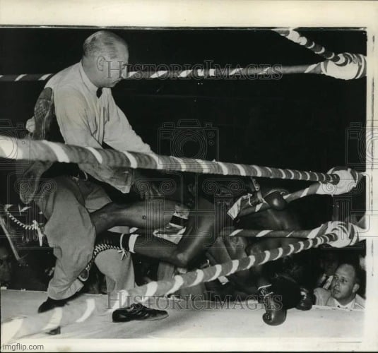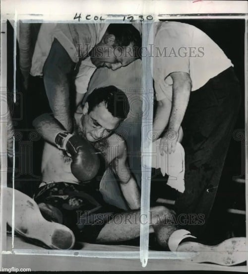 Iconic photo right here. There's different kinds of shell shock, there's the shell shock of being in a real war, which nothing can compare to. But there's also the shell shock of being in physical combat with another person inside of a ring, taking physical beatings. This is one of my favorite boxing photos ever taken, Carmen Basilio aka "The Onion Farmer" being held back by the referee after stopping Tony DeMarco aka "The Boston Bomber" in round 12 of their November 1955 rematch in Boston for the world welterweight title. Basilio and DeMarco put eachother through pure hell, and this image captures the shell shock on Basilio's face at the conclusion of two brutal wars with DeMarco. Tony DeMarco was a hard hitting, relentless man, they didn't call him "The Boston Bomber" for nothing. They took years off of each other's careers and their rivalry is one of the most epic in boxing history. In the rematch, Basilio retained the world welterweight title he won from DeMarco in their first fight which ended in almost identical fashion when Basilio TKO'D DeMarco at 1:52 in round 12. At the conclusion of their rivalry, Basilio said of DeMarco, "When he hits you, you know you've been hit. All you have to do is ignore the effects. If you think it's going to hurt, then it will." Carmen Basilio was a hard man. Make no mistake about that.