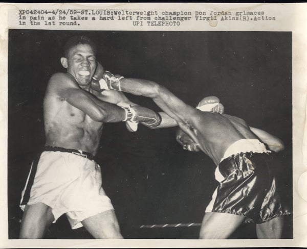 Don Jordan defeated Virgil Akins in their first match for the world welterweight title on April 24, 1959, by unanimous decision in 15 rounds. Jordan won the fight by outboxing the hard-hitting champion Akins with a strong left jab and right hand, despite Akins's aggressiveness. This victory upset the 7,344 attendees at the Olympic Auditorium in Los Angeles and made Jordan the new world welterweight champion. The fight got very rough, with both fighters spilling through the ropes.