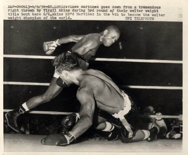 "A dark cloud has been hanging over me since the night I won [the welterweight title in 1958]," Akins later said. "Nobody expected me to beat Vince Martinez, including all my friends. They even bet on Martinez and when I saw them they'd say, 'Hey, I lost a lot of money because of you.' Even my cousin bet against me. He was mad at me for years and every time he'd see me he'd say, 'You owe me money.'"
