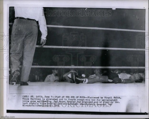 Virgil Akins vs Vince Martinez. If you're not familiar with Vince Martinez, he was one tough and clever SOB with an iron chin, going into this fight with Akins, Martinez had a record of 60-5, and had never been knocked down in a fight. This was a one-sided affair, with Akins on the attack from the opening bell, sending Martinez to the canvas seven times before the slaughter was finally stopped and the referee intervened in round four to declare Akins the new world welterweight champion by a TKO.