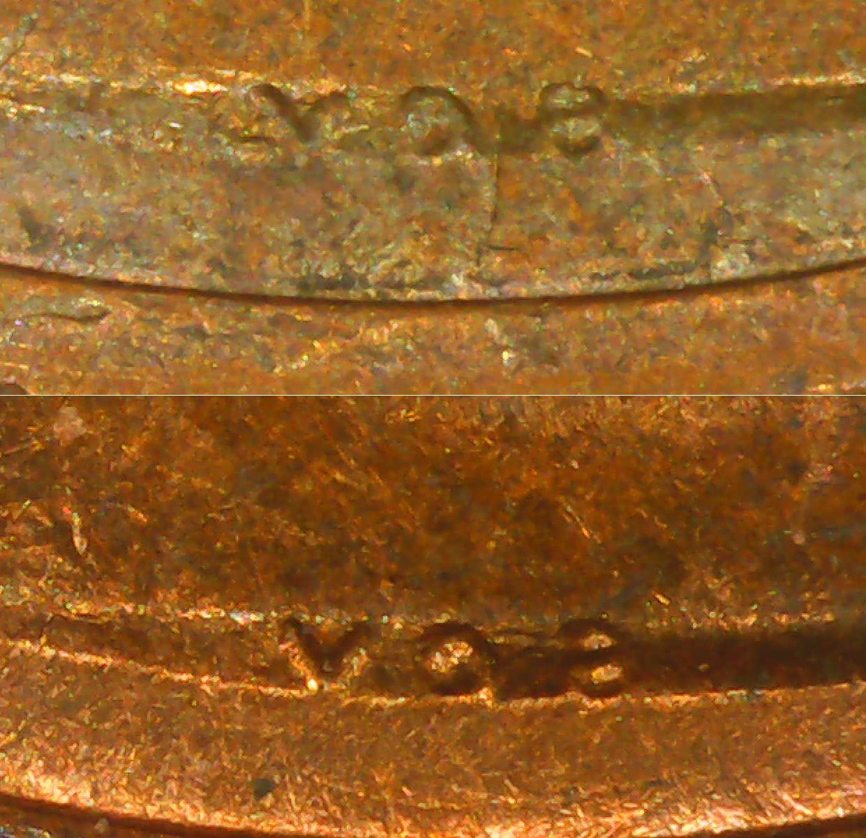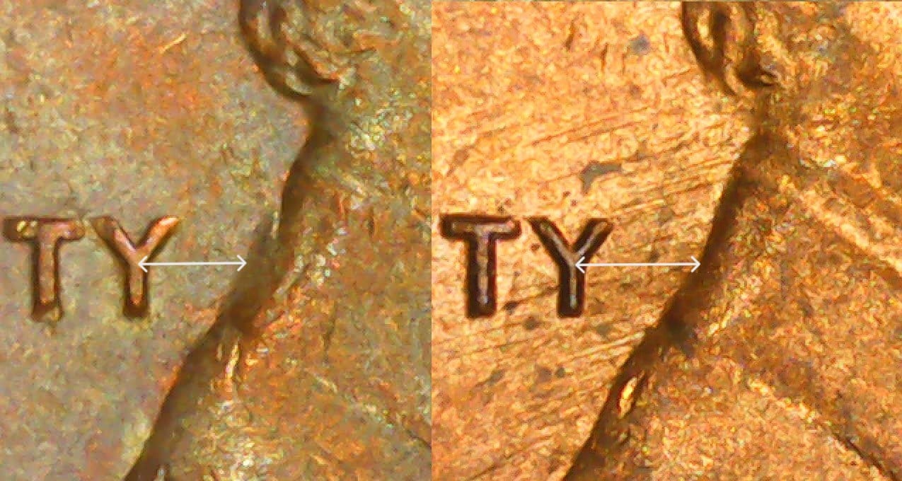The top liberty seems closer to Lincoln then the other coin. The "TY" seems different on each coin.
