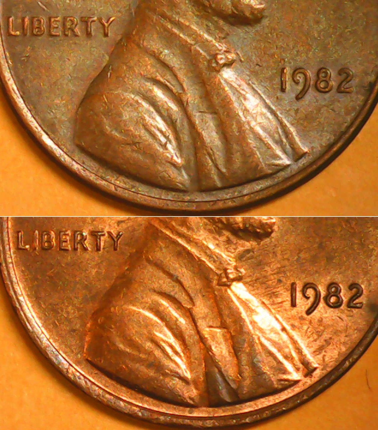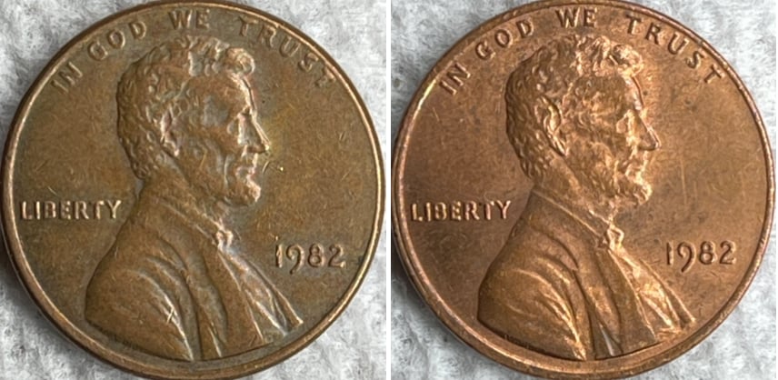 Hi everyone! Recently I came across a different looking 1982 copper LMC that seemed a bit different from what I'm used to seeing. In my pictures it's the brown looking 82. At first glance it looks like a small date 1982. However, the 9 and the 82 seemed different and smaller then what I'm used to seeing. The 9 doesn't appear as wide and seems like a different 9 compared to the other coin? Also, some of the devices seem smaller when compared to another small date copper 1982. Liberty is positioned slightly closer to Lincoln on the brown coin and further away on the other coin. The designer initials are slightly different on each coin.