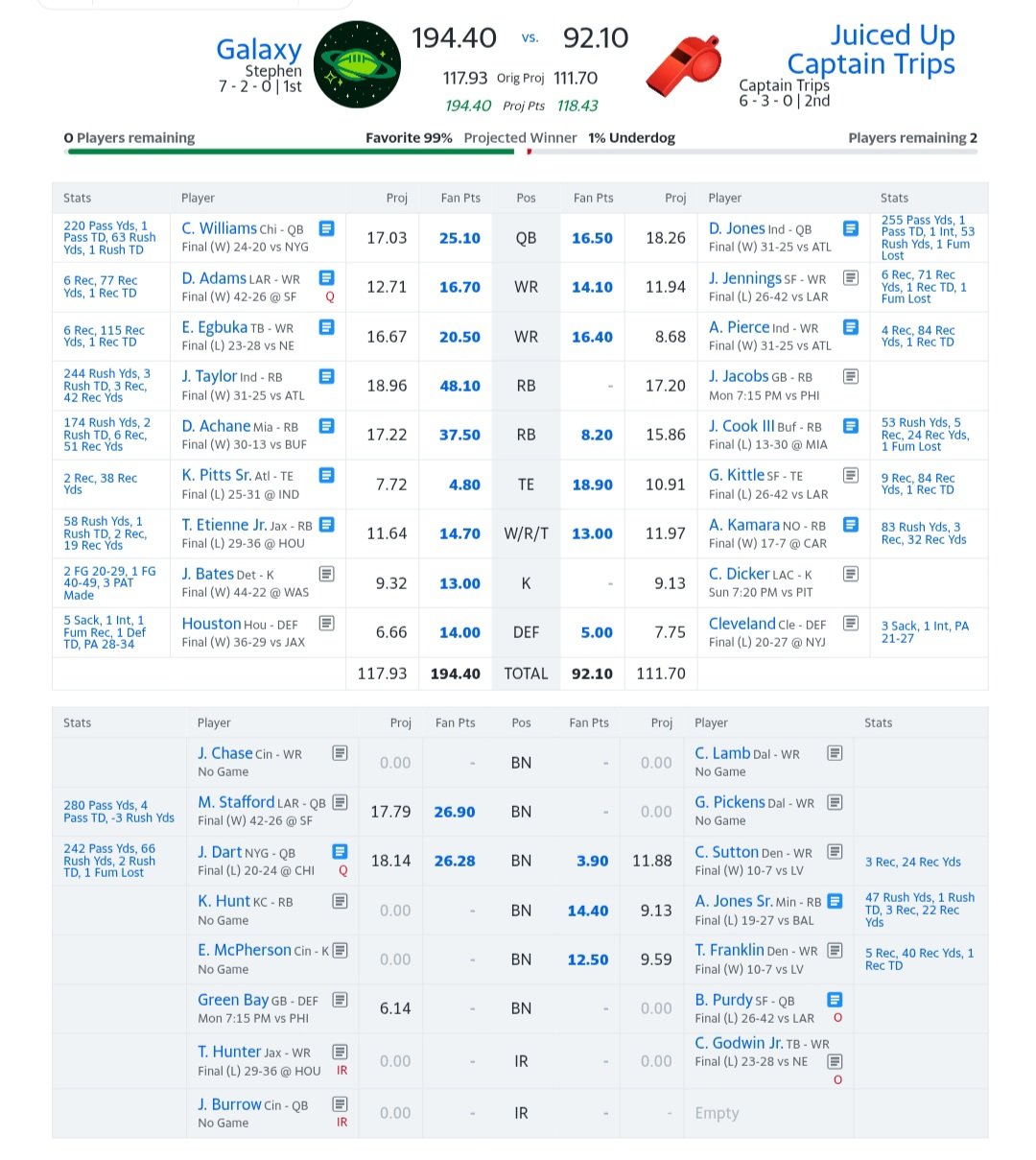 gotta toot my own horn for a moment. if i gambled half as well as i've played fantasy football in the past decade, i'd be a profitable degenerate. have to show you guys what i did to this poor sap today. the coroner is going to need help identifying this cat because i dismembered him. not sure i've ever seen 200 in a week before, and i almost got there. and i had one of my biggest studs on the bench due to a bye (Chase).