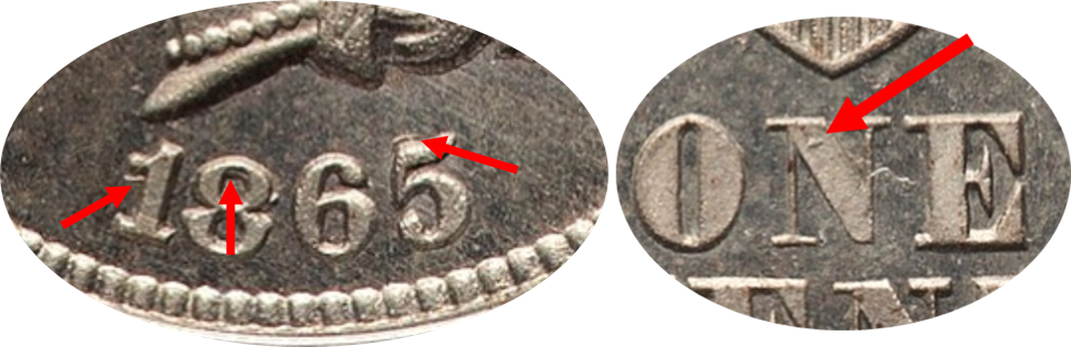 The Obverse is from the same die used to strike the circulating bronze issues designated as Snow-1; showing the repunching at upper serif of 1 and within loops of 8, also at the top of the 5 in date. The Reverse appears to be the reverse die used to strike circulating bronze cents of the date, specifically Snow-l; a raised die lump is seen on the N in ONE.