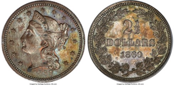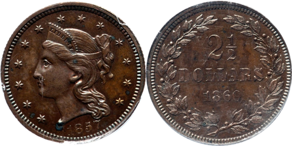 The rationale behind the mint's production of this piece remains unclear; however, its creation is appreciated. Featuring two distinct dates—1857 on the obverse and 1860 on the reverse—the pattern also incorporates the coronet bust design found on the Three-Cent Nickel of 1865–1889. The same coronet bust was also used on two other patterns dedicated in 1857: a "One Cent" piece and another quarter eagle pattern.