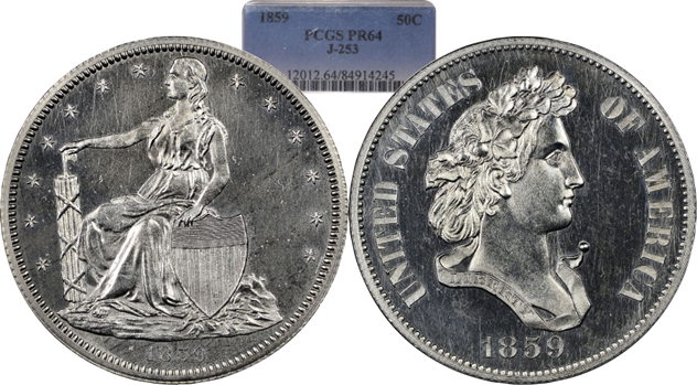 Judd-244 (Pollock-300) 1859 50c (Half Dollar) Longacre’s “French Head” obverse with a regular reverse of a Half Dollar of 1859. Struck in copper with Reeded Edge