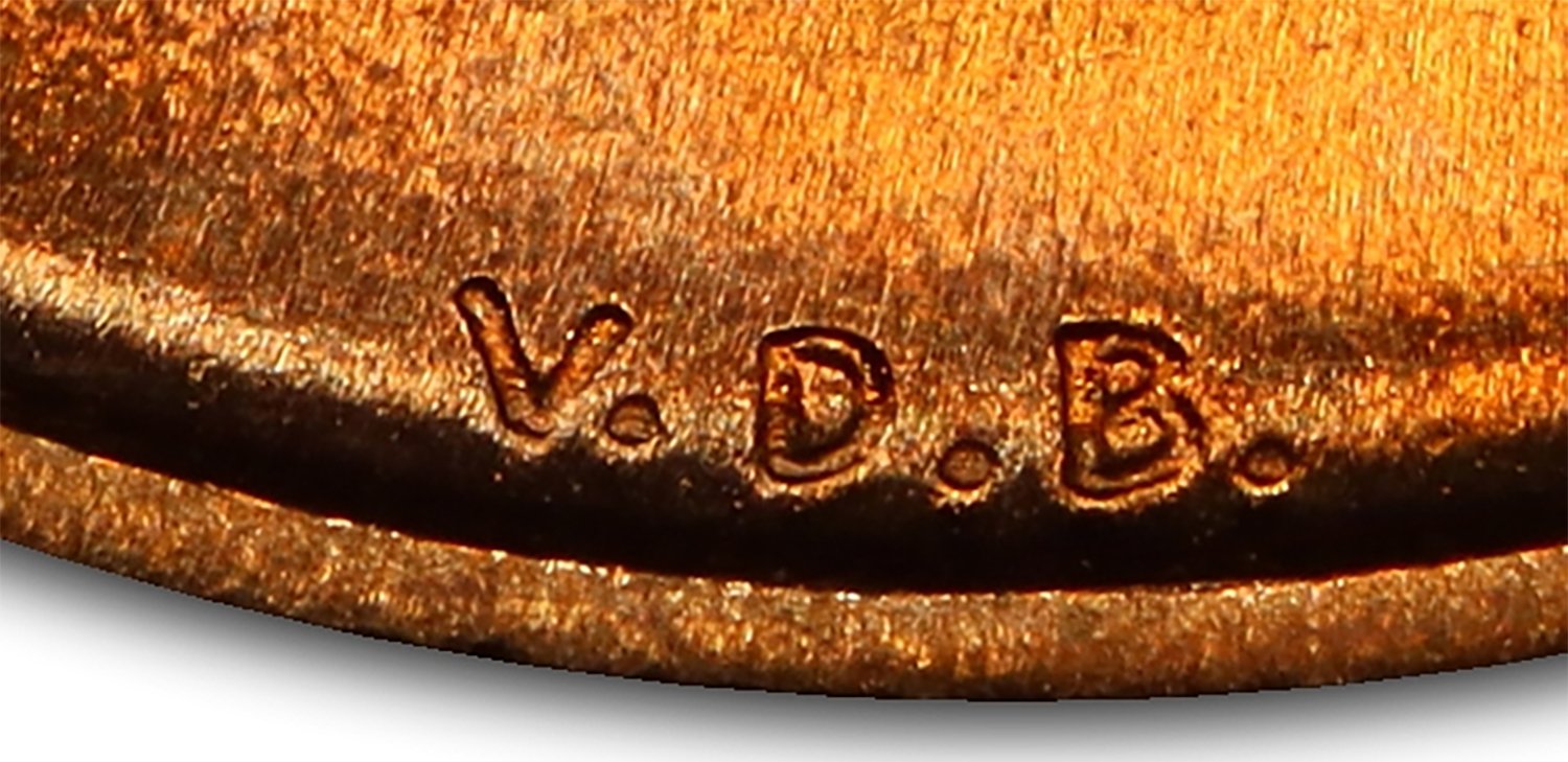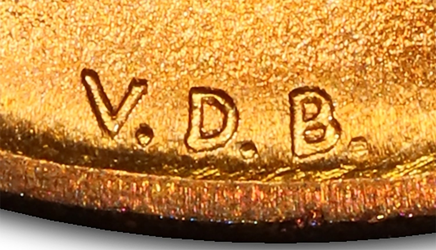 << <i>The initials were hand cut into the master dies, unlike the rest of the inscriptions. (Brenner had been told to use initials, but the reverse model he sent had his name on it. Engraver Barber was told to replace the name with initials "VDB" so there would be no confusion with "B" for Barber.) >>