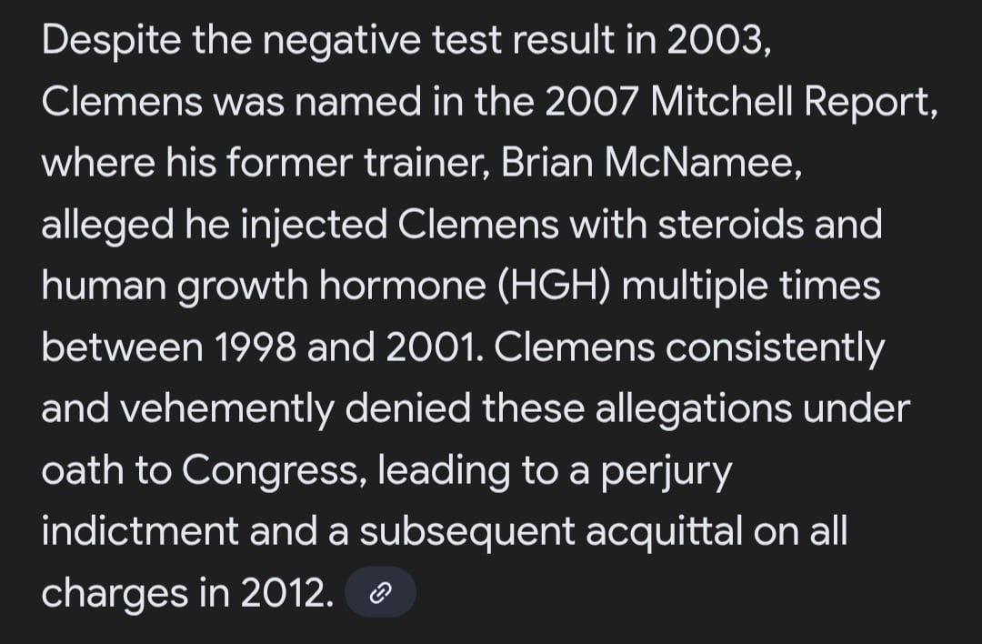 I have done ooodles of research about this case. there is really nothing there. Mostly Lester Munson going on ESPN every week to "report" on how guilty he thought Clemens was. then that narrative got into the public zeitgeist and the rest is history...