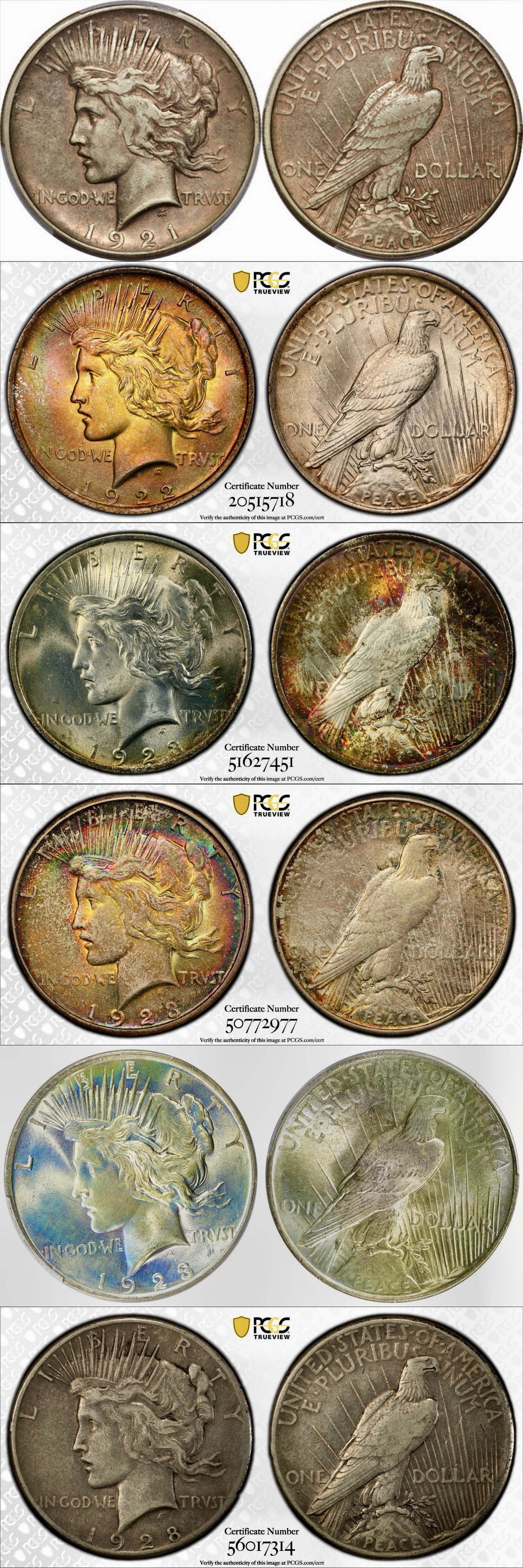 A few of my Peace toners. They are out there, but uncommonly rainbow toned. Usually they come in a gunmetal or orange hue. The premium on toned Peace dollars is also muted, when compared to toned Morgans, especially the rainbows & rim-toned specimens.