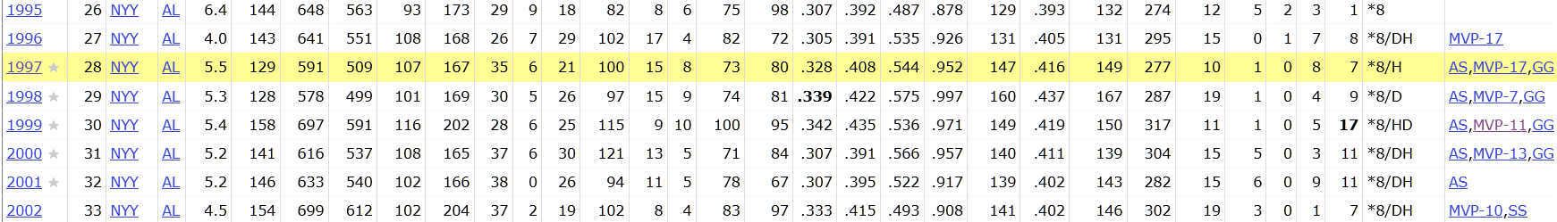 Bernie Williams is very underrated. 1995-2002 dude was total money. Yeah his power numbers were low in that roid era but he put up his numbers clean.