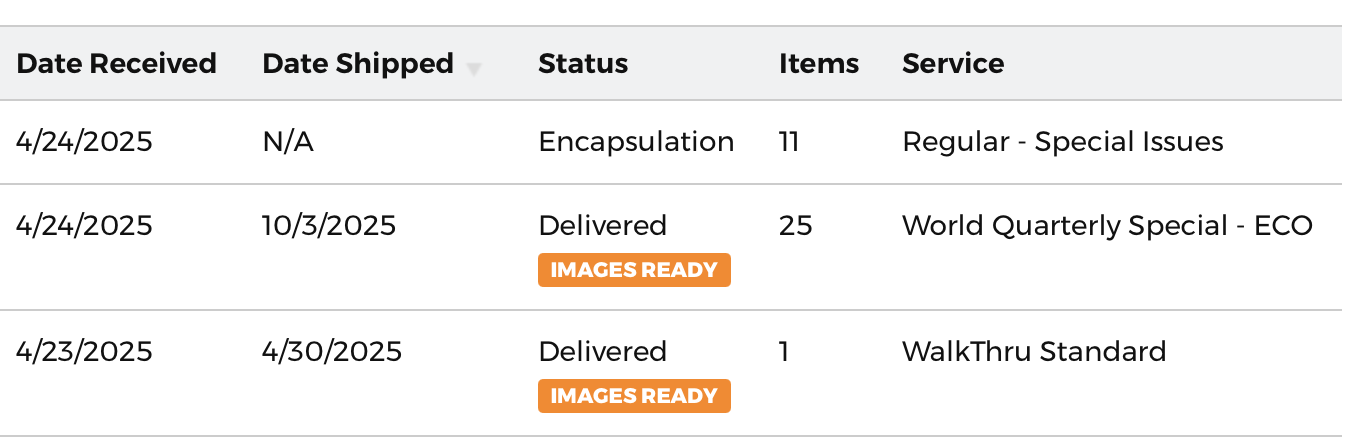In the Spring of this year, I sent a package to PCGS with three orders. It was entered on 24 April.