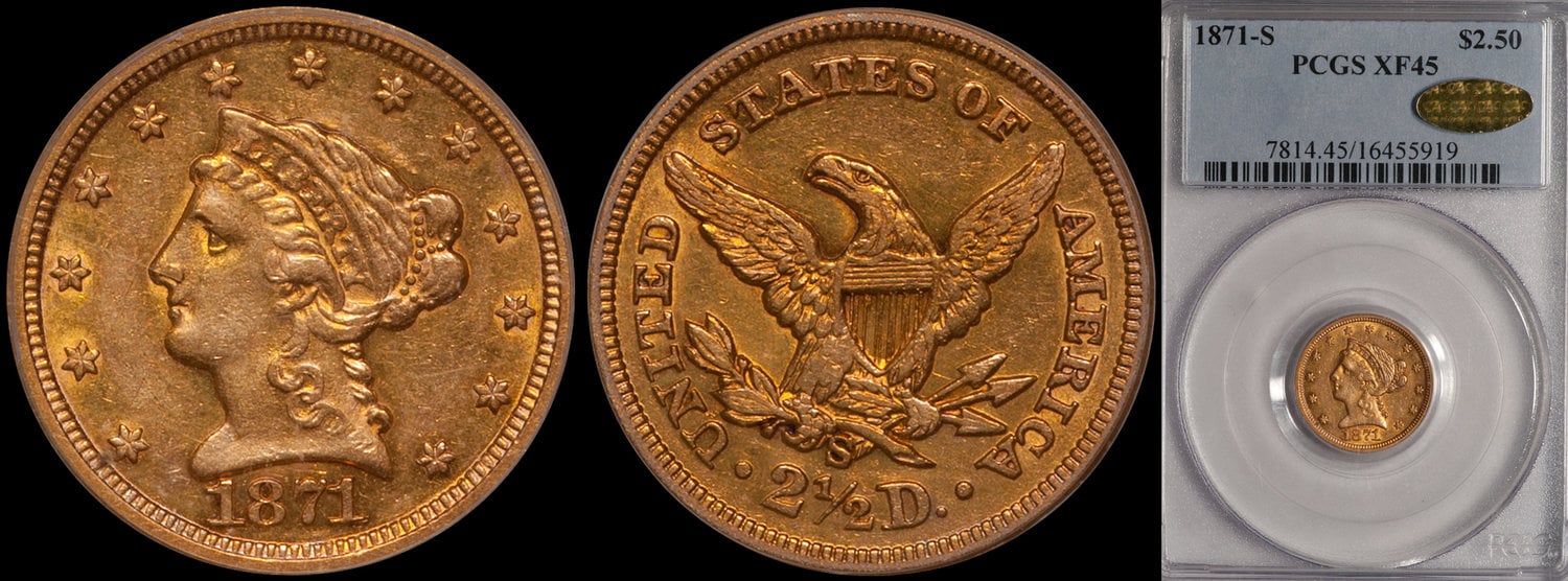 Love the quarter eagle - a gold coin with an odd denomination and not too much gold to be prohibitively expensive. Here's the one that got me interested in quarter eagles. Yes, it has a weak D if you look really close. Bought it raw as a 1911, and only a few months later after reading more about the series and the 1911-D did I realize it had the right die characteristics. Now in a PCGS XF-40 holder.