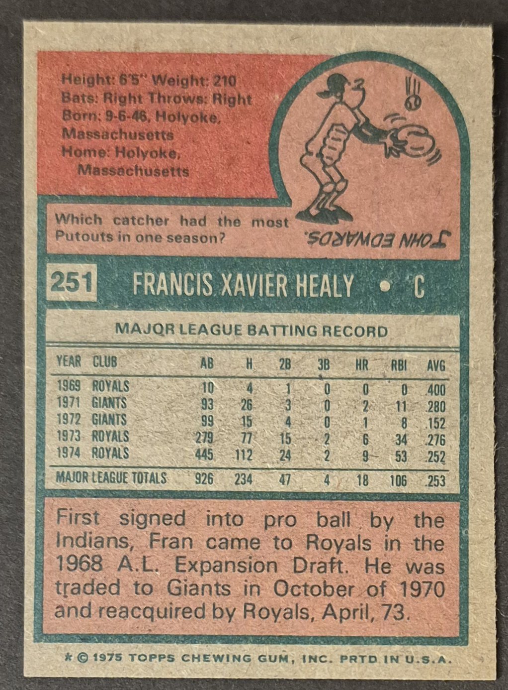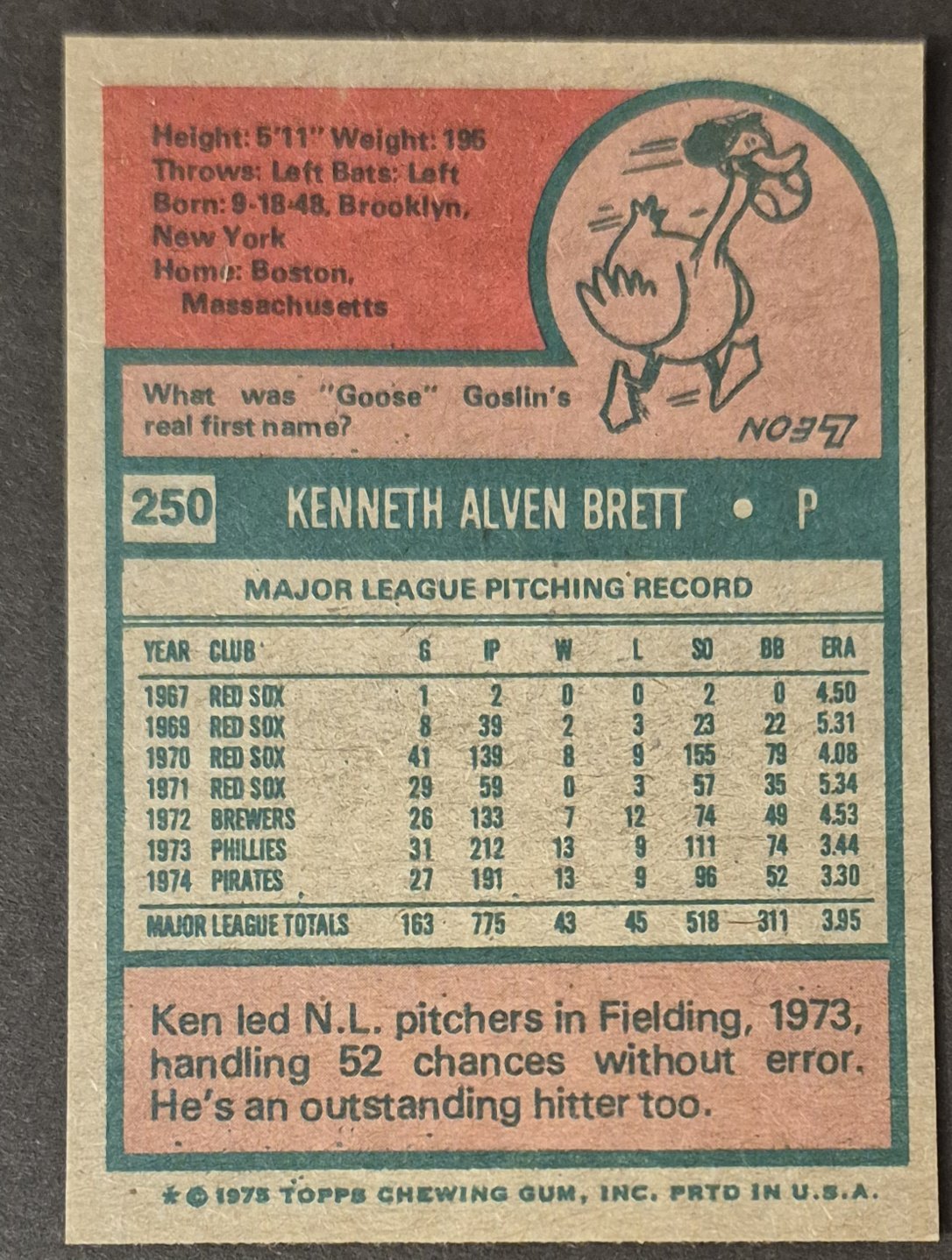 the 1975 Brett is probably my single favorite Baseball card. I love the image of a young George Brett and I love the color scheme of the card. to me it is just perfect!! Not from KC (or even close) but George was always one of my favorites growing up. he was grit personified. I never got to see him play live, but every time he was playing the Red Sox, i was tuned in, seeing if he could bounce a double off the monster or rip a line drive to deep center and leg out a triple.