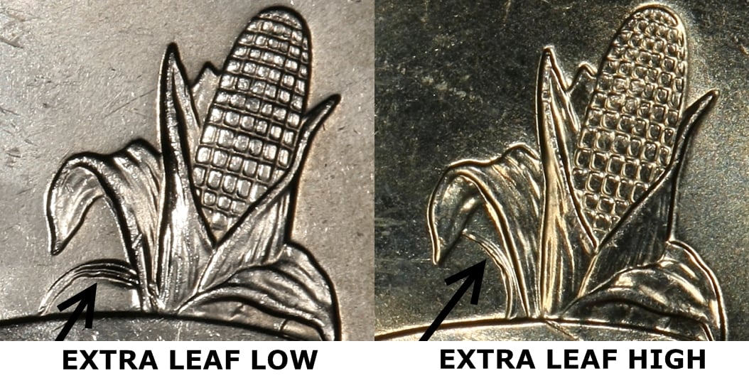 The "low leaf" version does cross over to other elements. At the right end, it crosses over another leaf. The way these arcs are formed is consistent with an impact on the die face after the die had been hubbed.