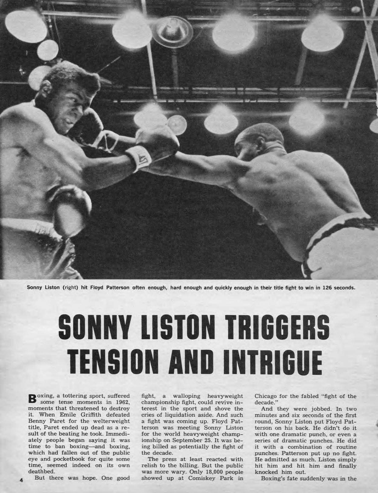 Floyd Patterson was an all-time great and he fought Sonny Liston twice, both fights combined lasted a total of two rounds, Sonny Liston needed just 126 seconds to take the heavyweight title from Patterson in 1962 at Comiskey Park. About halfway through the first round, Liston hurt Patterson with a right uppercut. Liston followed with a series of punches, ending with a left hook, that dropped Patterson. He made it to his feet but was unable to beat the referee's count of ten. The contract stated that if Liston won, he would have to give Patterson a rematch within a year. The rematch between Liston and Patterson was almost a carbon copy of the first fight, this time Liston needed only 130 seconds. Liston knocked Patterson down three times, with the fight ending at 2:10 in the first round.