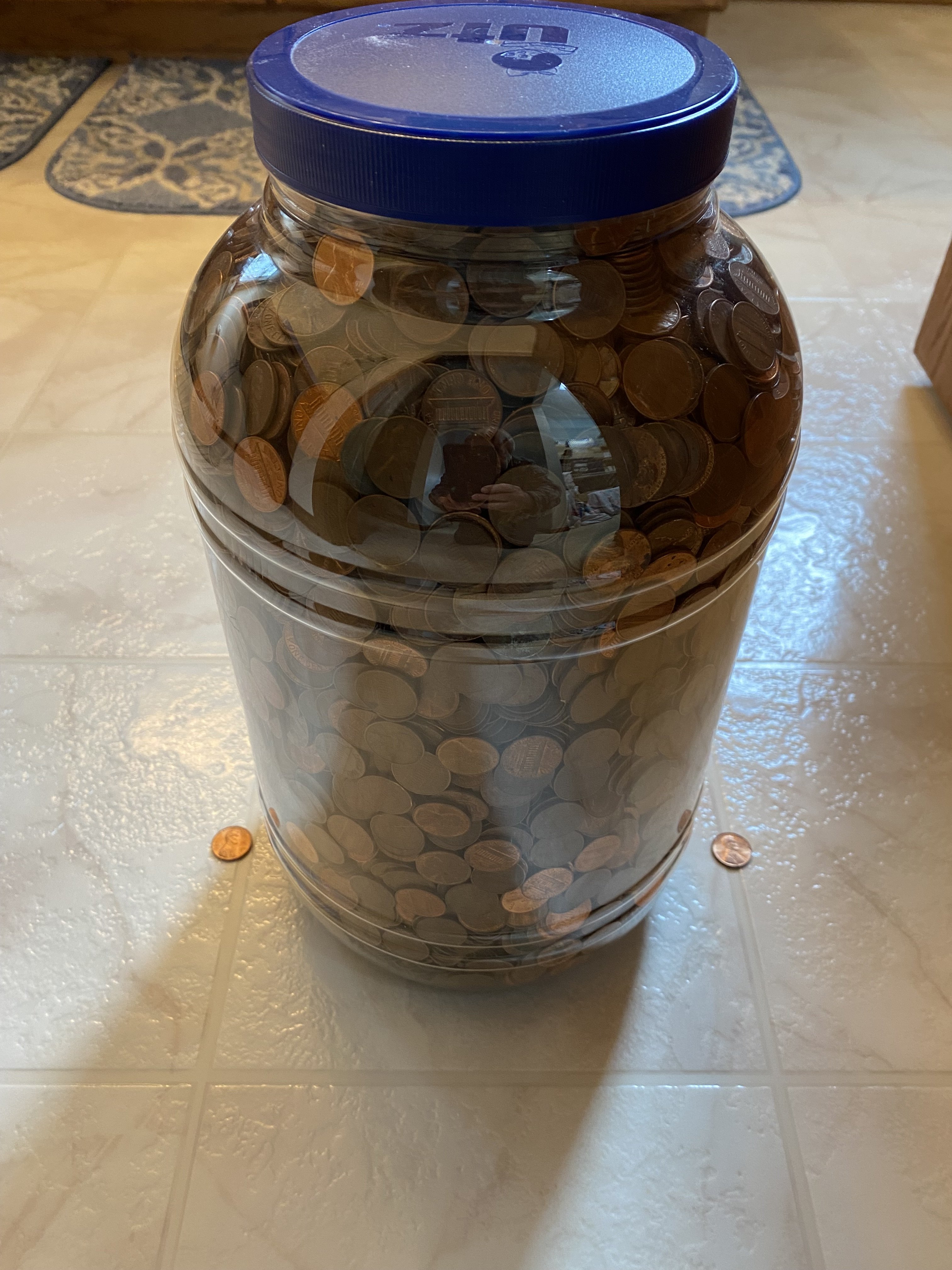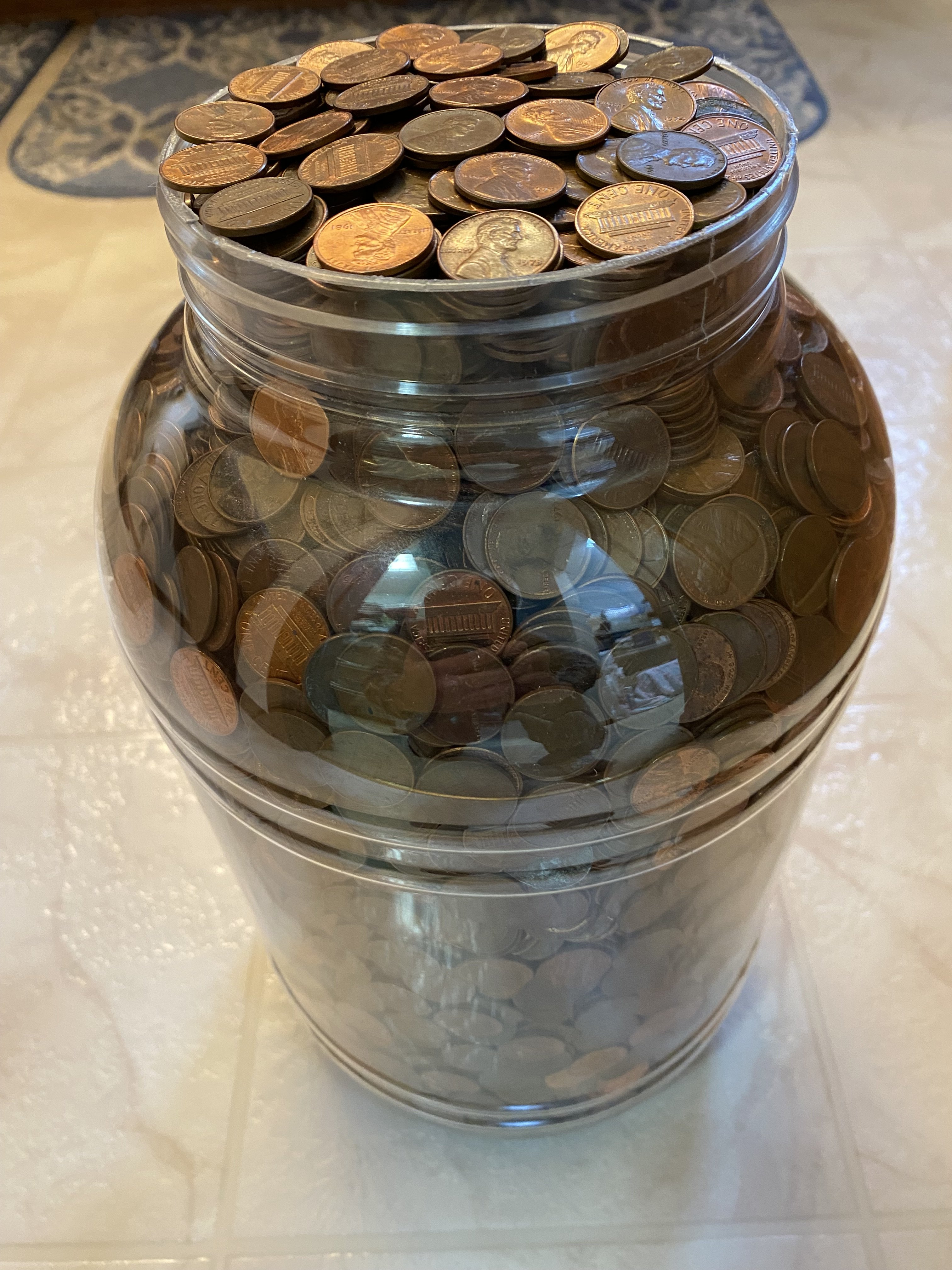 I have a 5 gal jug that is over a third full. All pennies go in it so no idea of copper vs zinc.