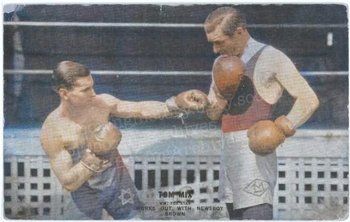 Newsboy Brown (left) and movie star Tom Mix. Tom Mix was a pioneering American cowboy and movie star, famous for his starring roles in early Western films from 1909 to 1935. He was a real-life cowboy and stuntman who performed his own daring tricks, becoming a Hollywood superstar and one of the biggest names of the silent film era.
