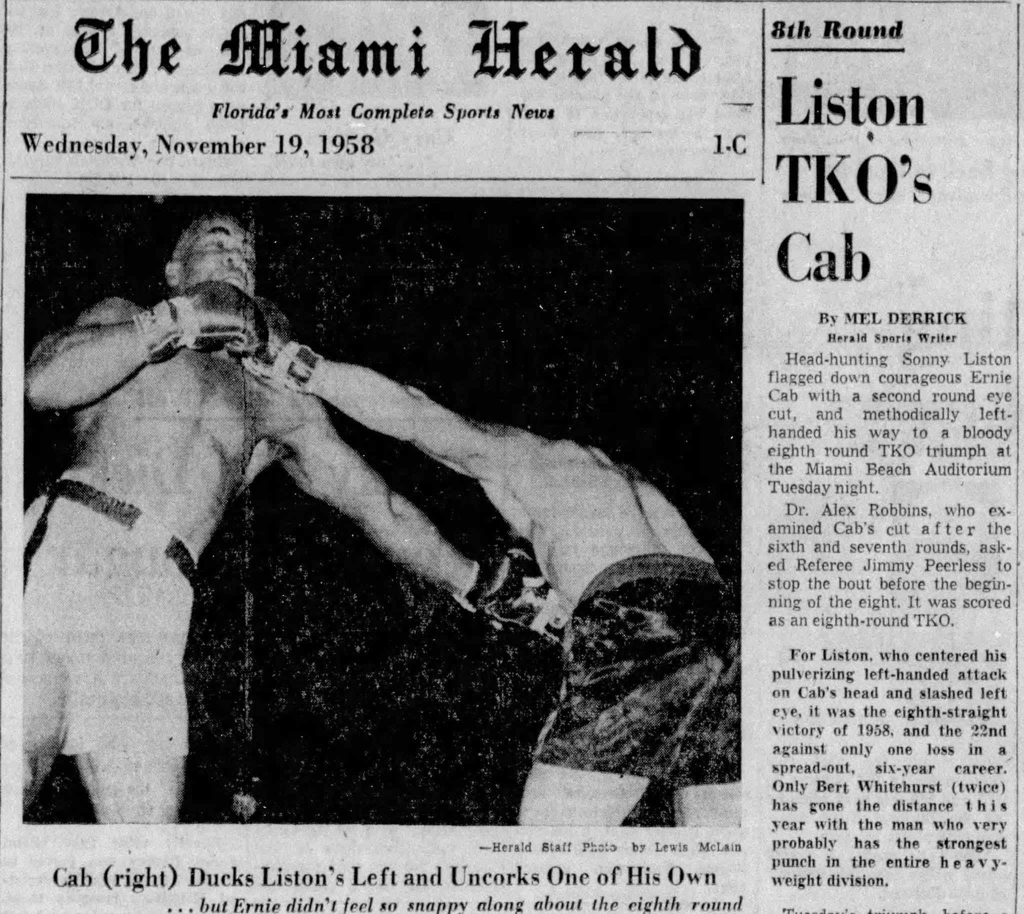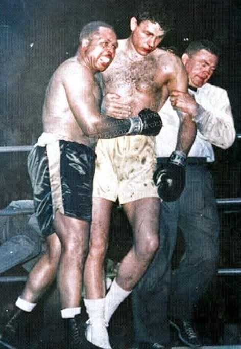 This shot is from the first Sonny Liston-Cleveland Williams fight, great shot, you can see how brutal it was, Liston's nose is broken and bleeding. Williams was a murderous puncher and he caught Liston with some thunderous shots. But this fight really demonstrated what a nightmare Liston was, Williams hit him with the kitchen sink and it just didn't matter, Sonny still smashed him.