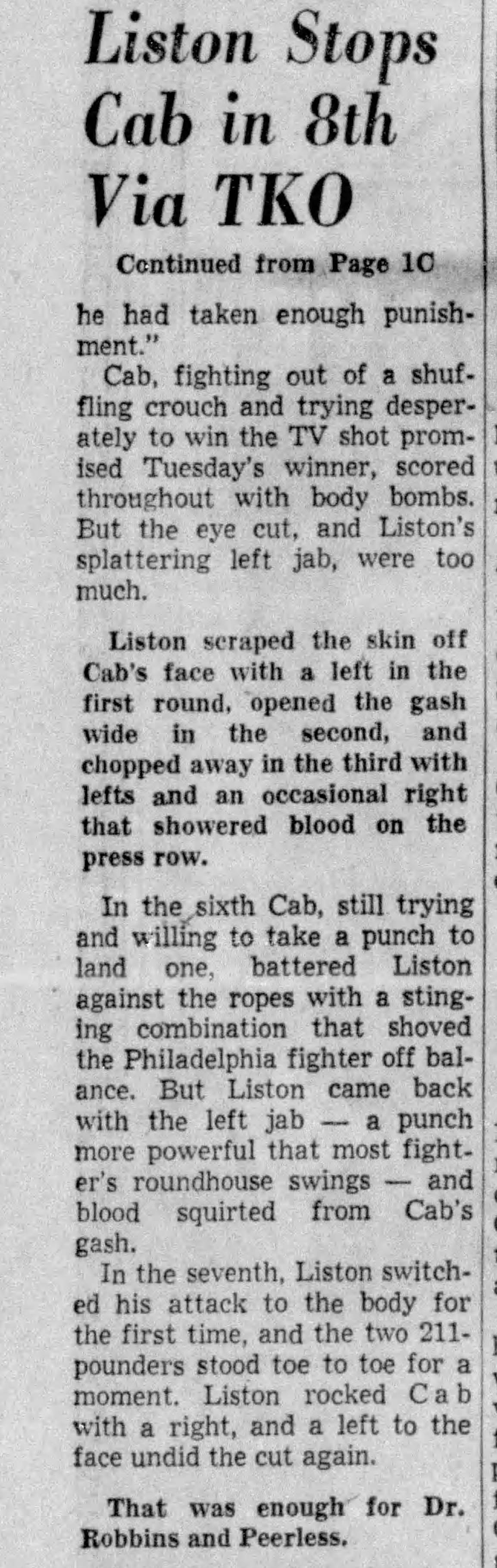 Sonny Liston: He threw it right from the shoulder, it was short, and he had everything behind it. That’s why it was a hard punch to get away from. I really didn’t get away from it too good. I wound up with 71 stitches, a broken nose and broken left cheekbone. Most of it was from the jab.