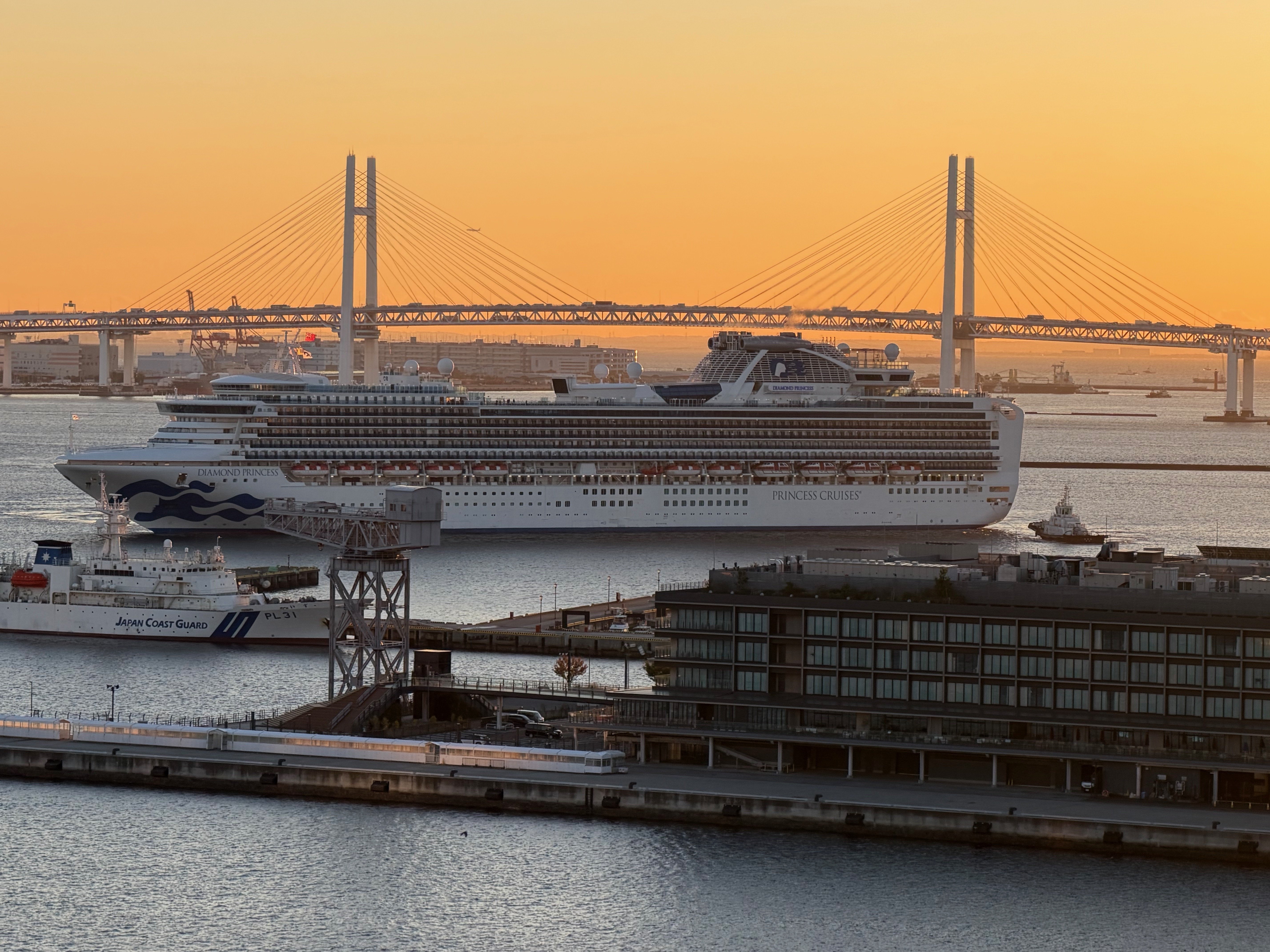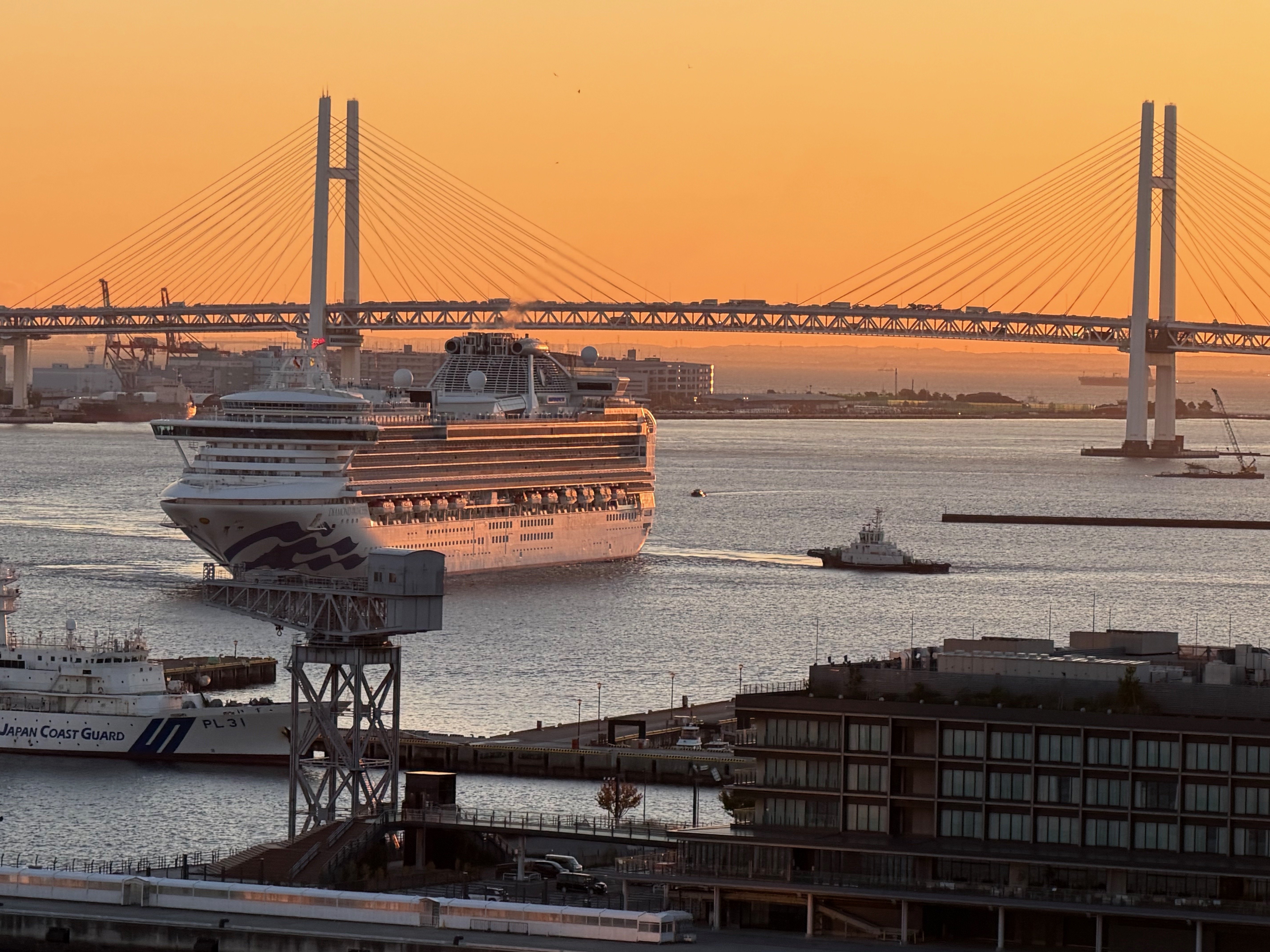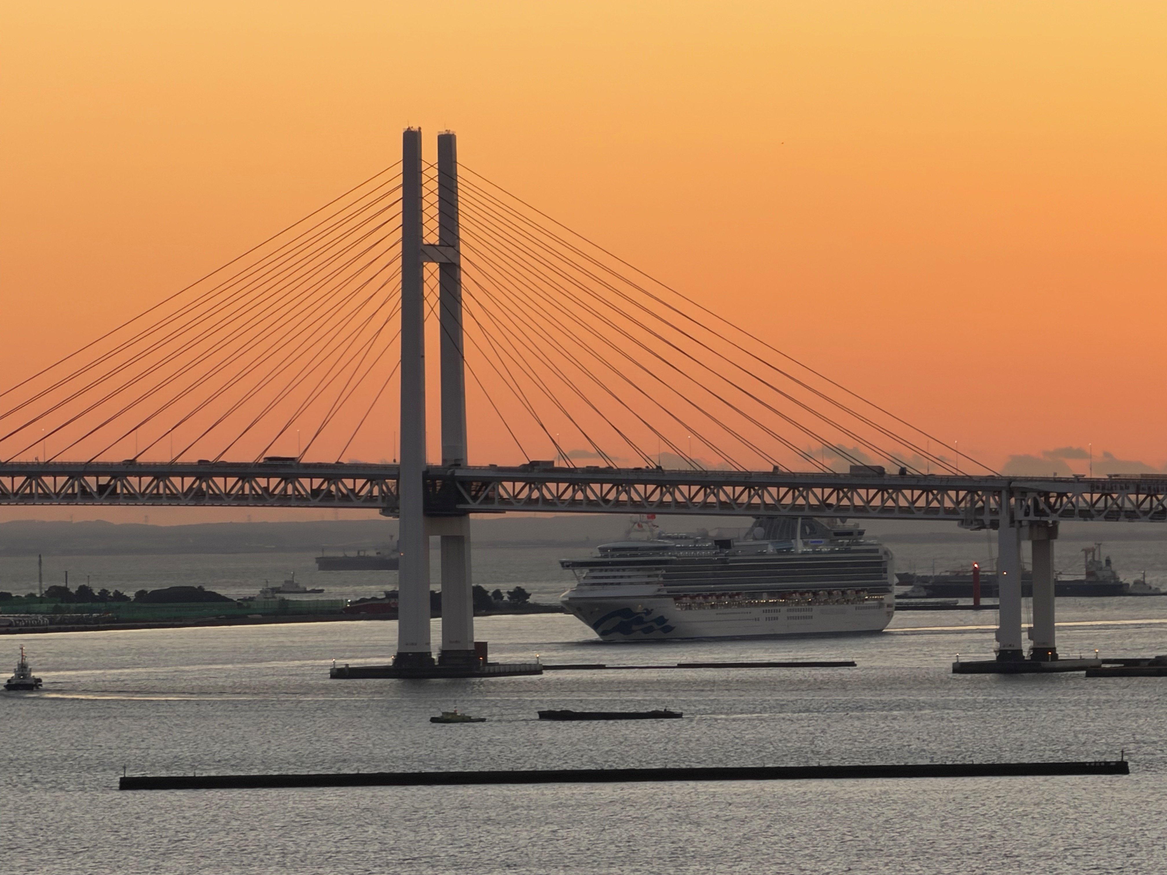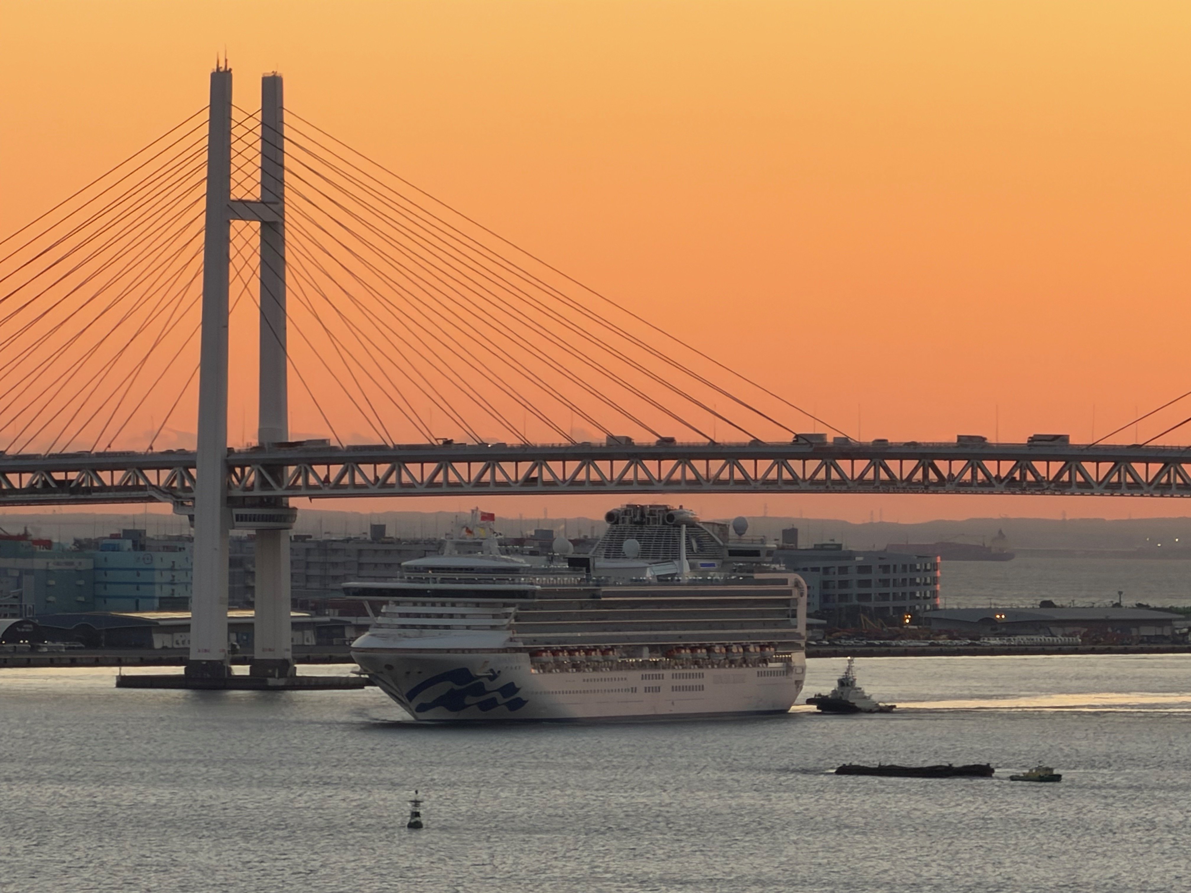 AS SUN RISES, CRUISE SHIP NARROWLY PASSES UNDER YOKOHAMA BAY BRIDGE WITH JUST FEET TO SPARE