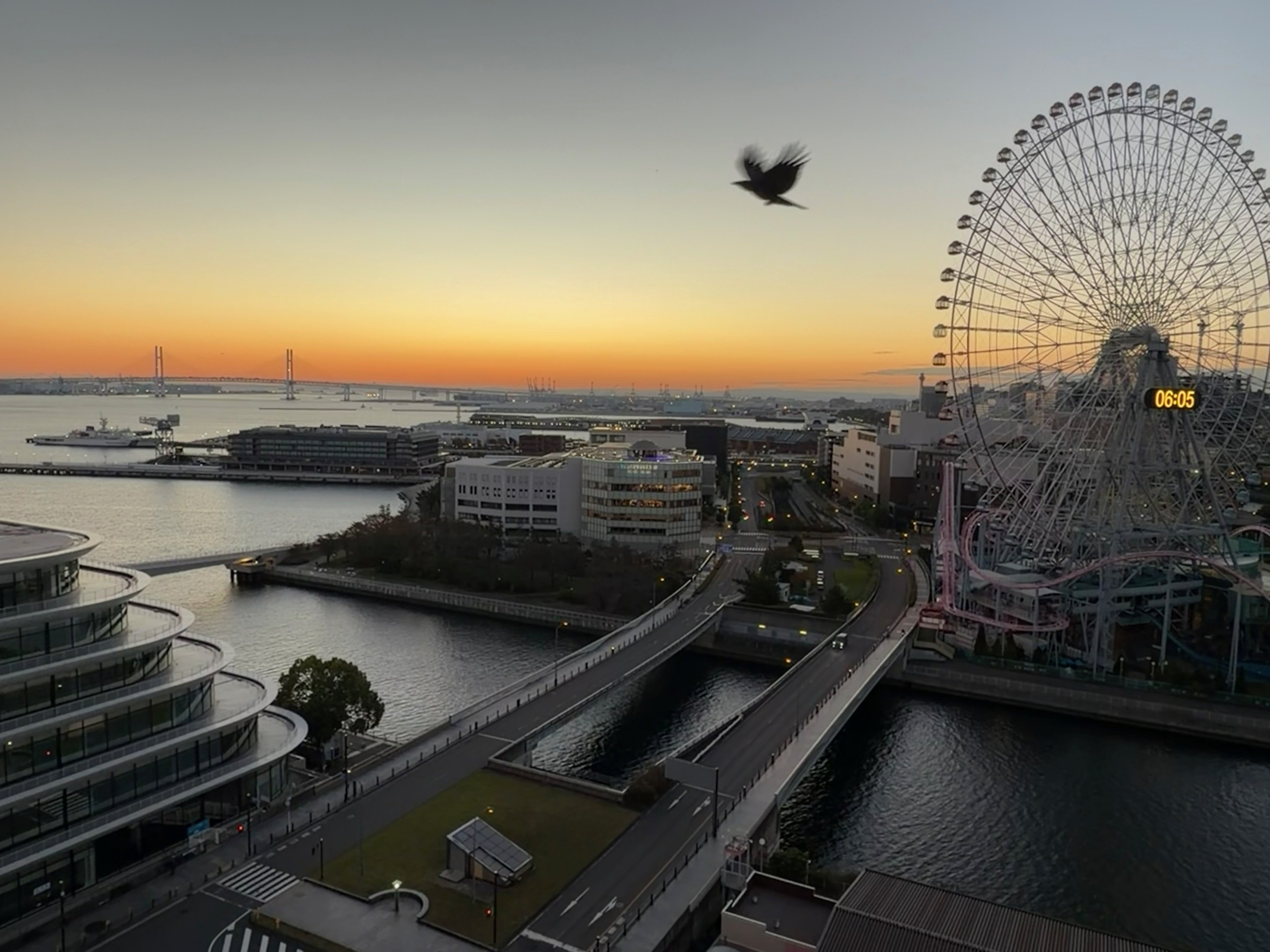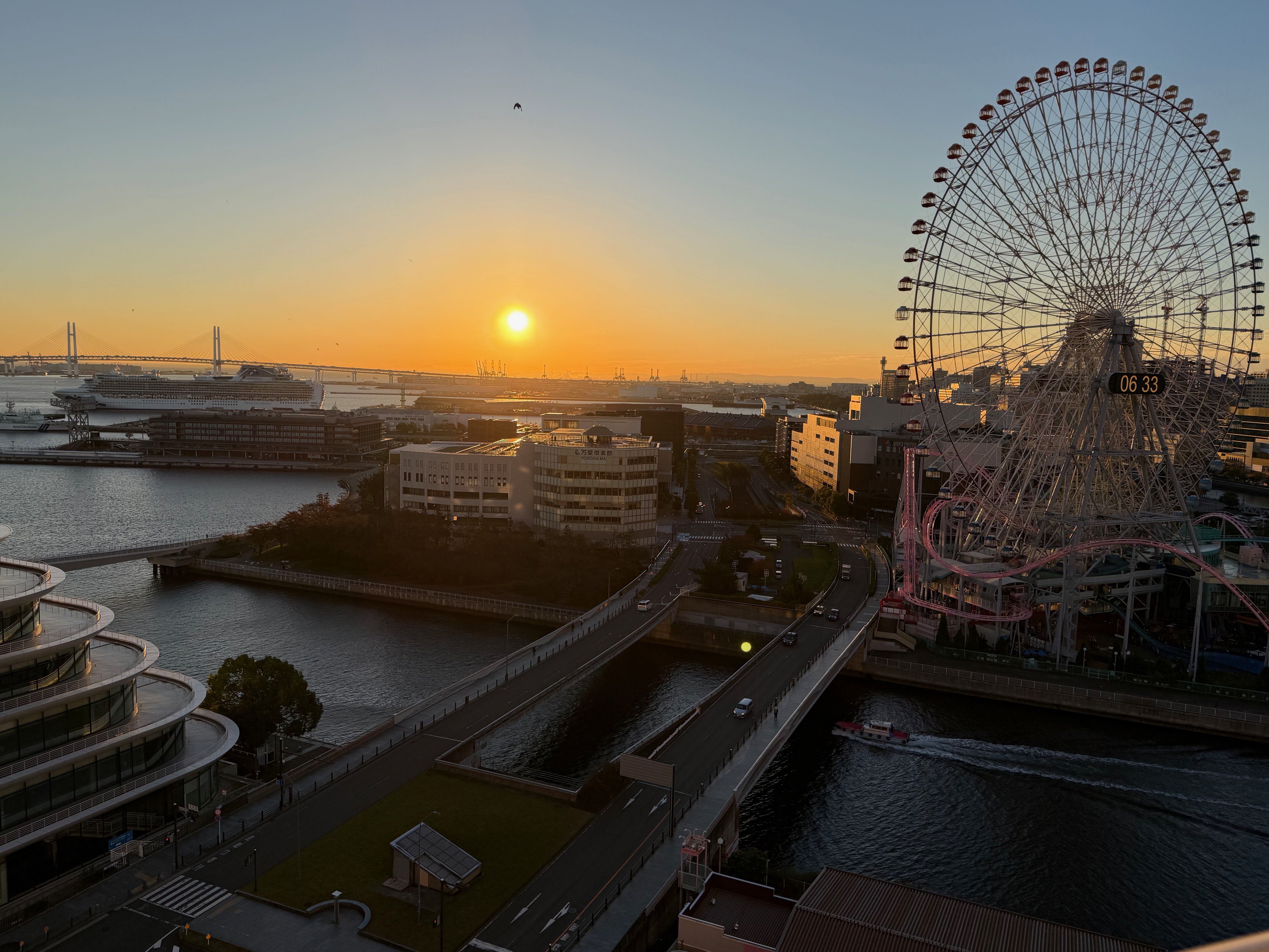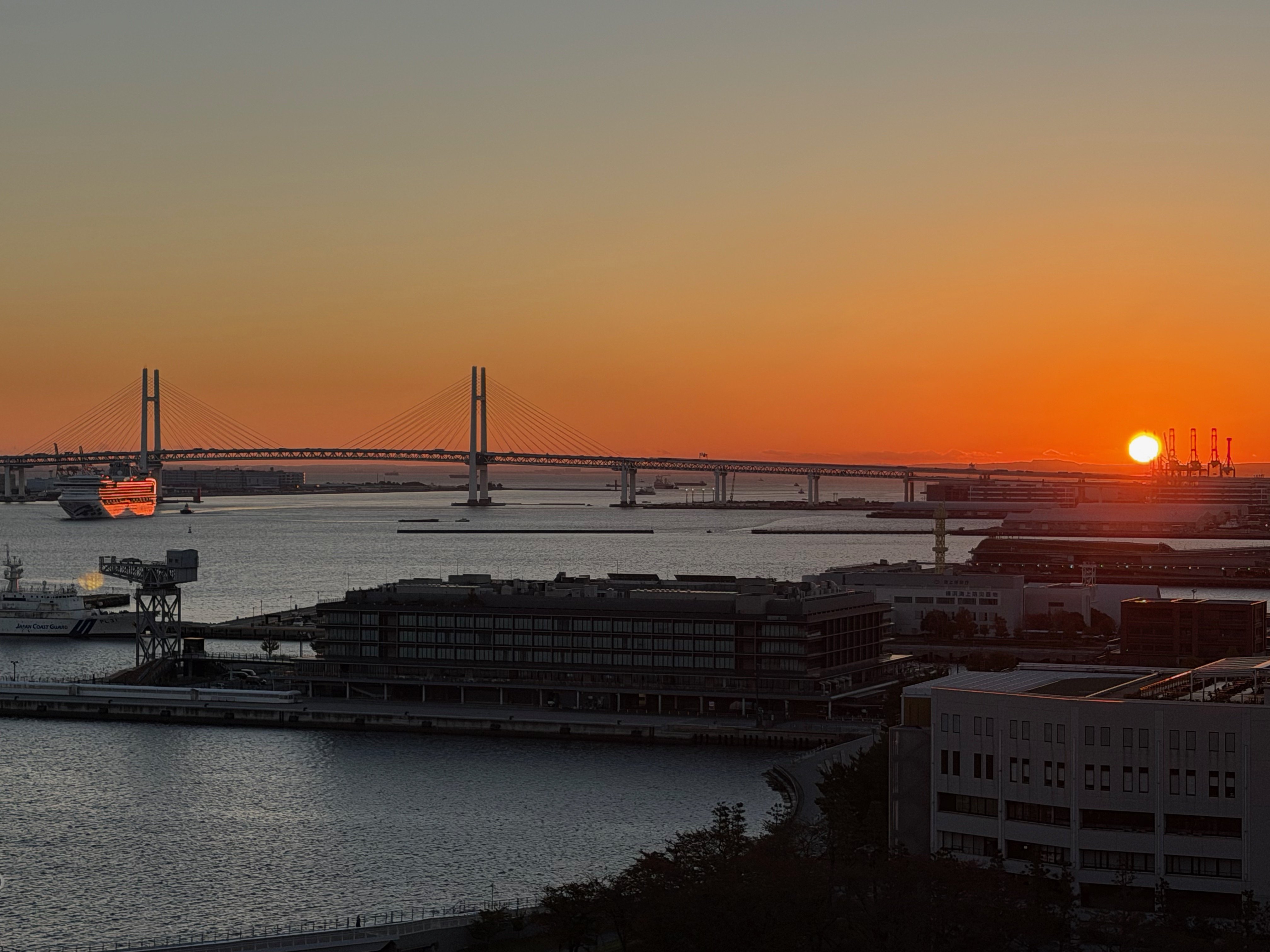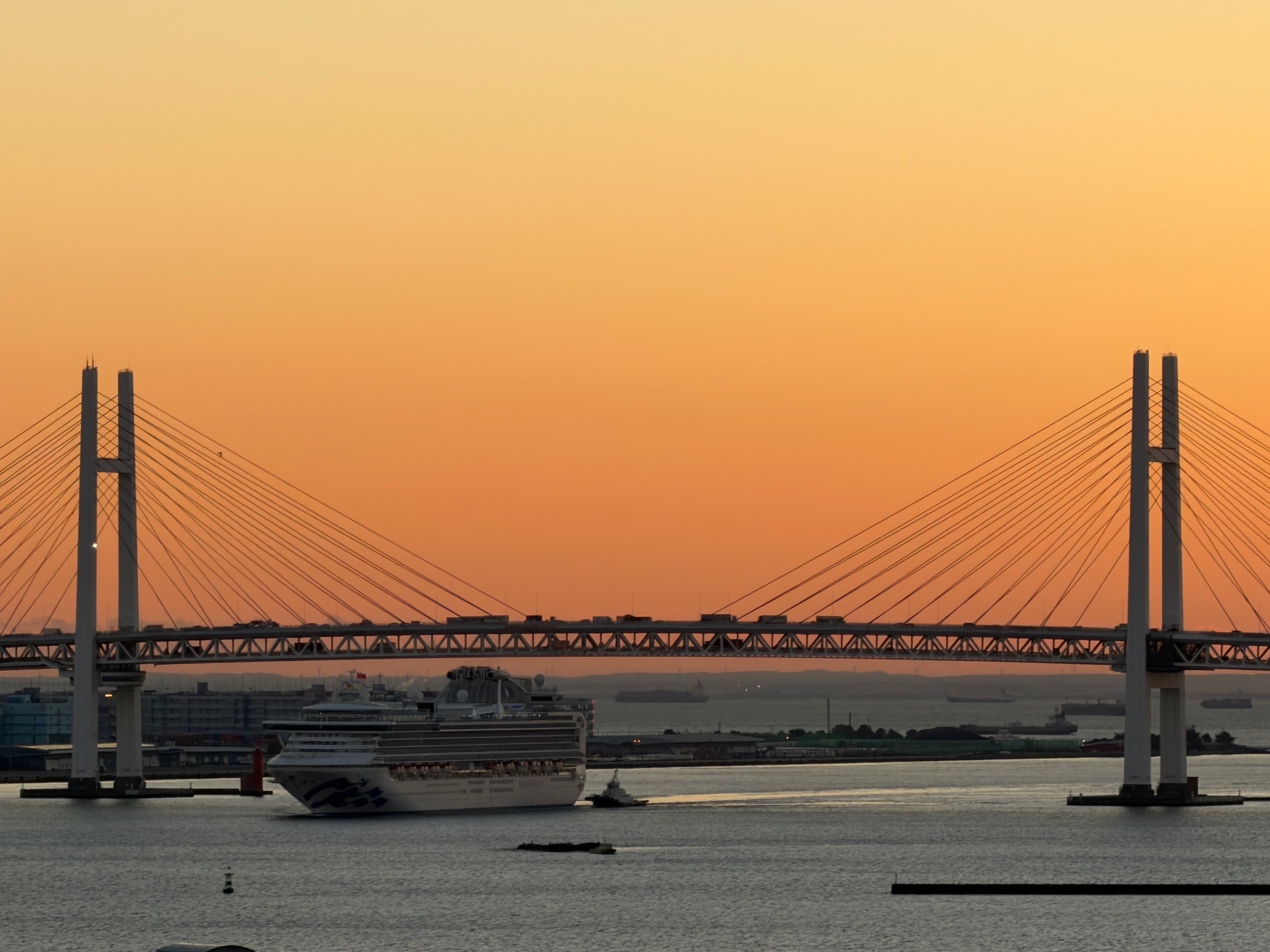 AS SUN RISES, CRUISE SHIP NARROWLY PASSES UNDER YOKOHAMA BAY BRIDGE WITH JUST FEET TO SPARE