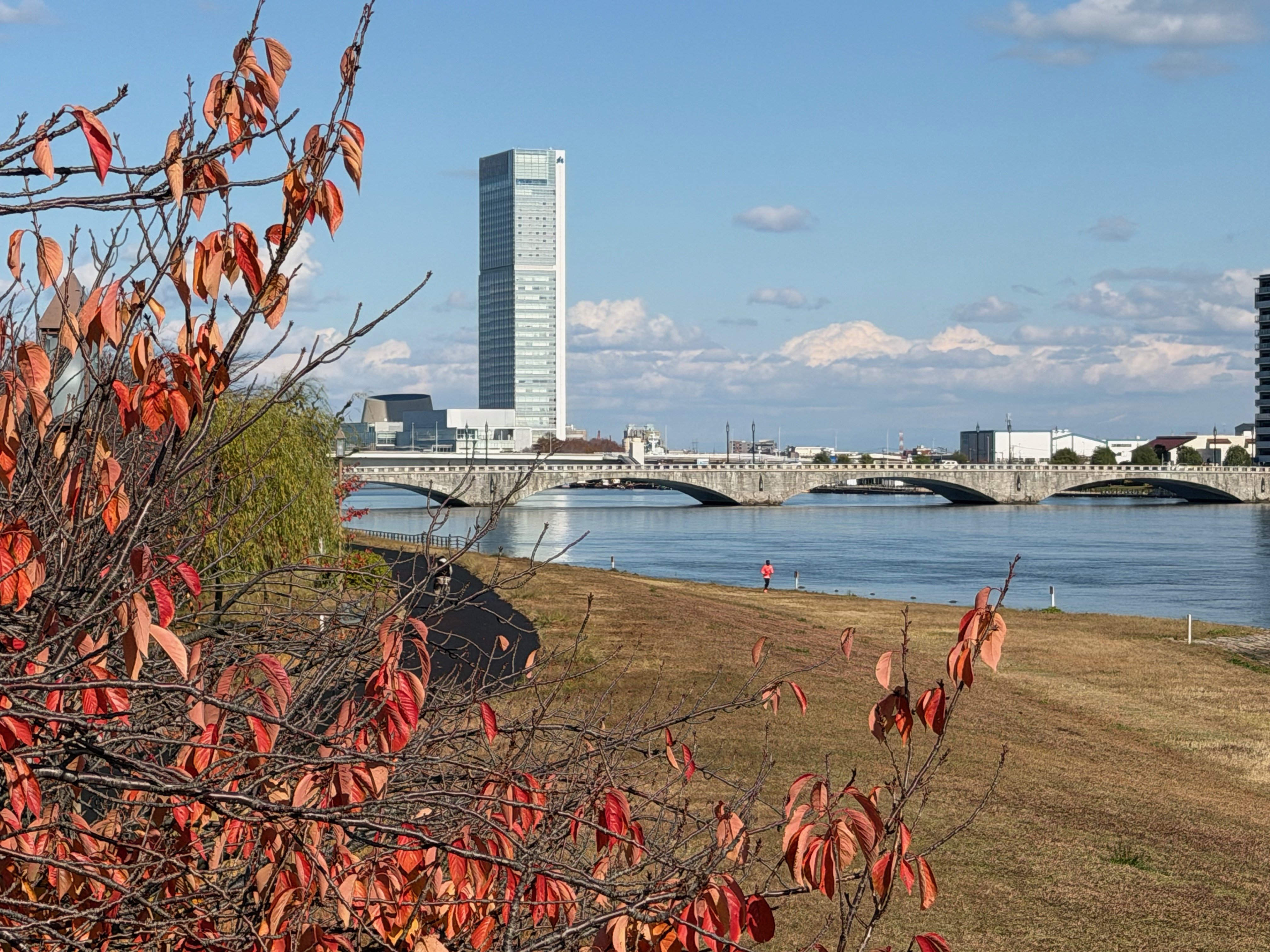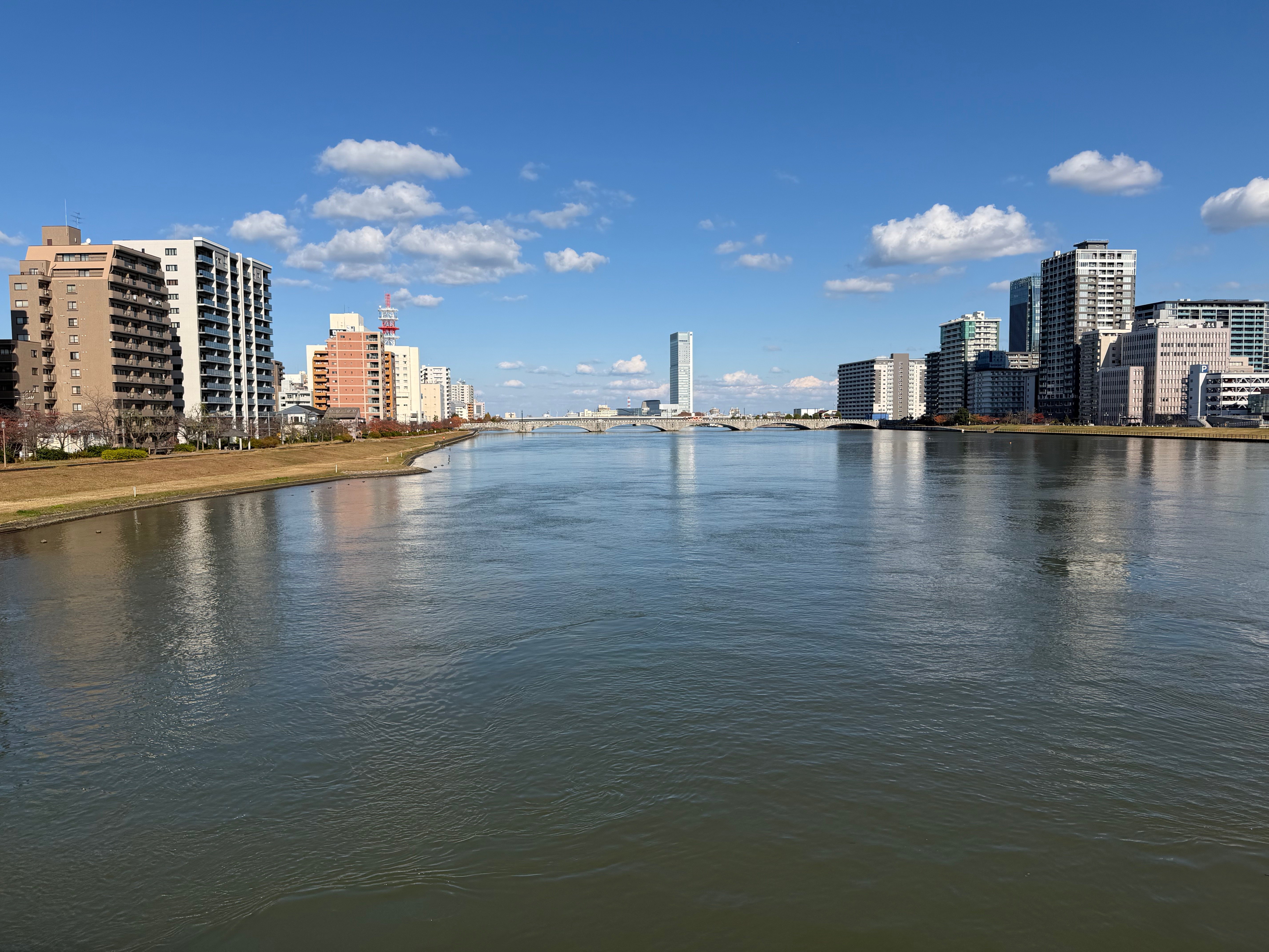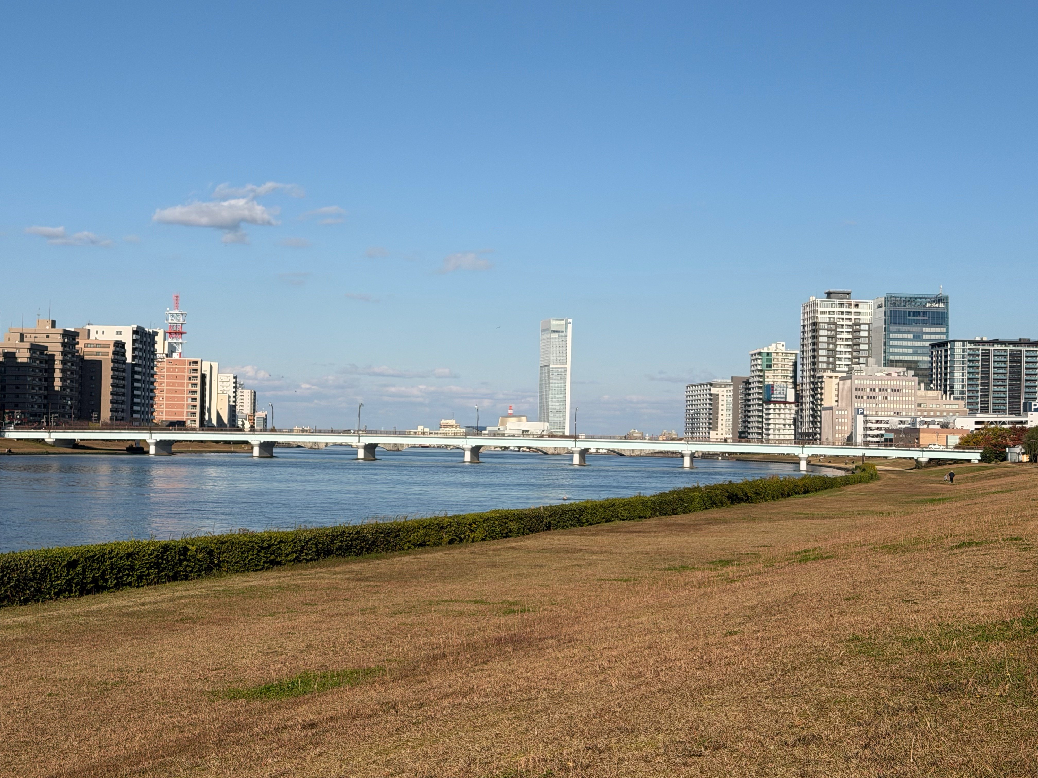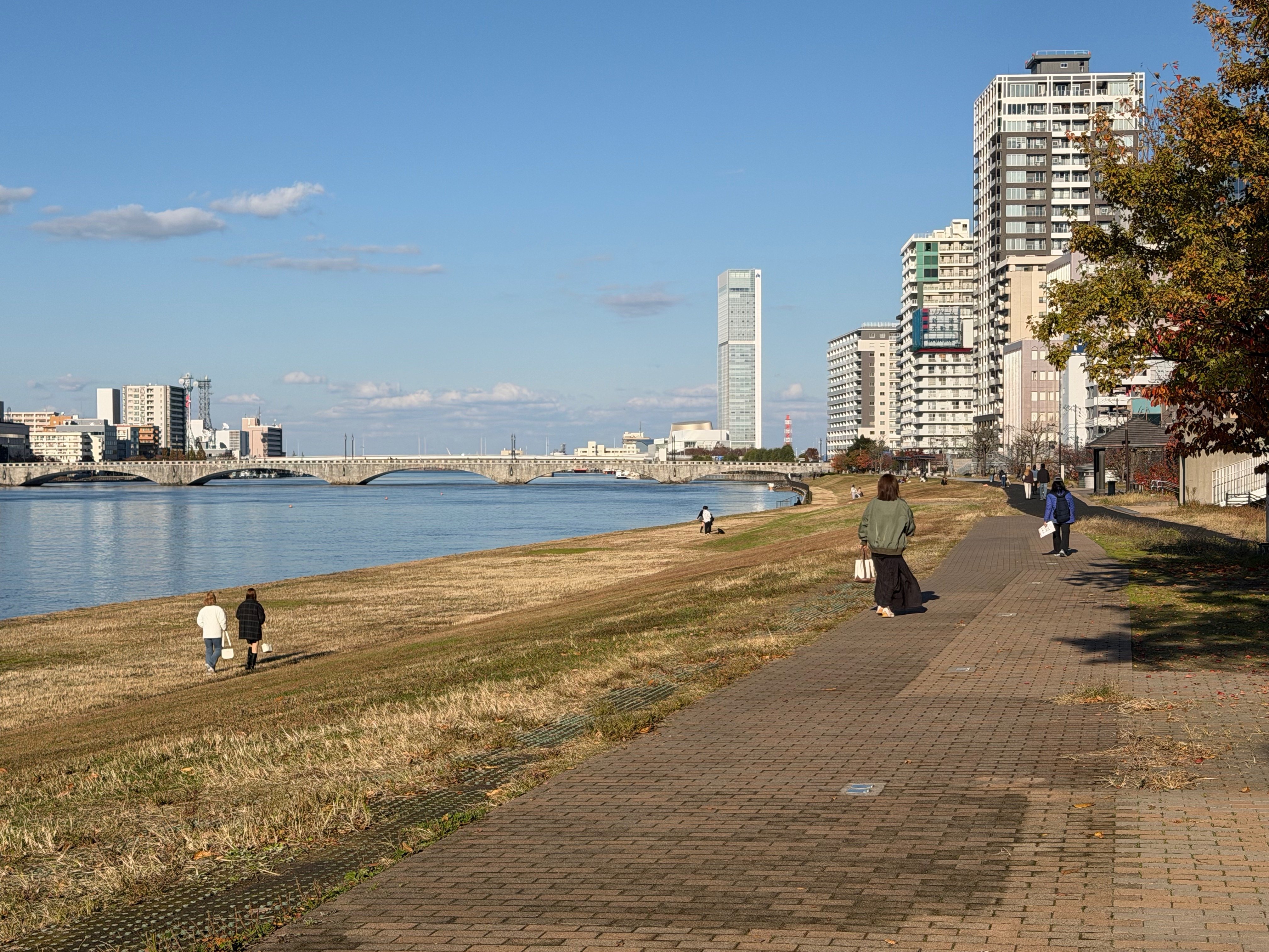 The walkway from Niigata's downtown to Hakusan Park is along a riverside promenade of Japan's longest and widest river, the 228 mile long Shinano River: