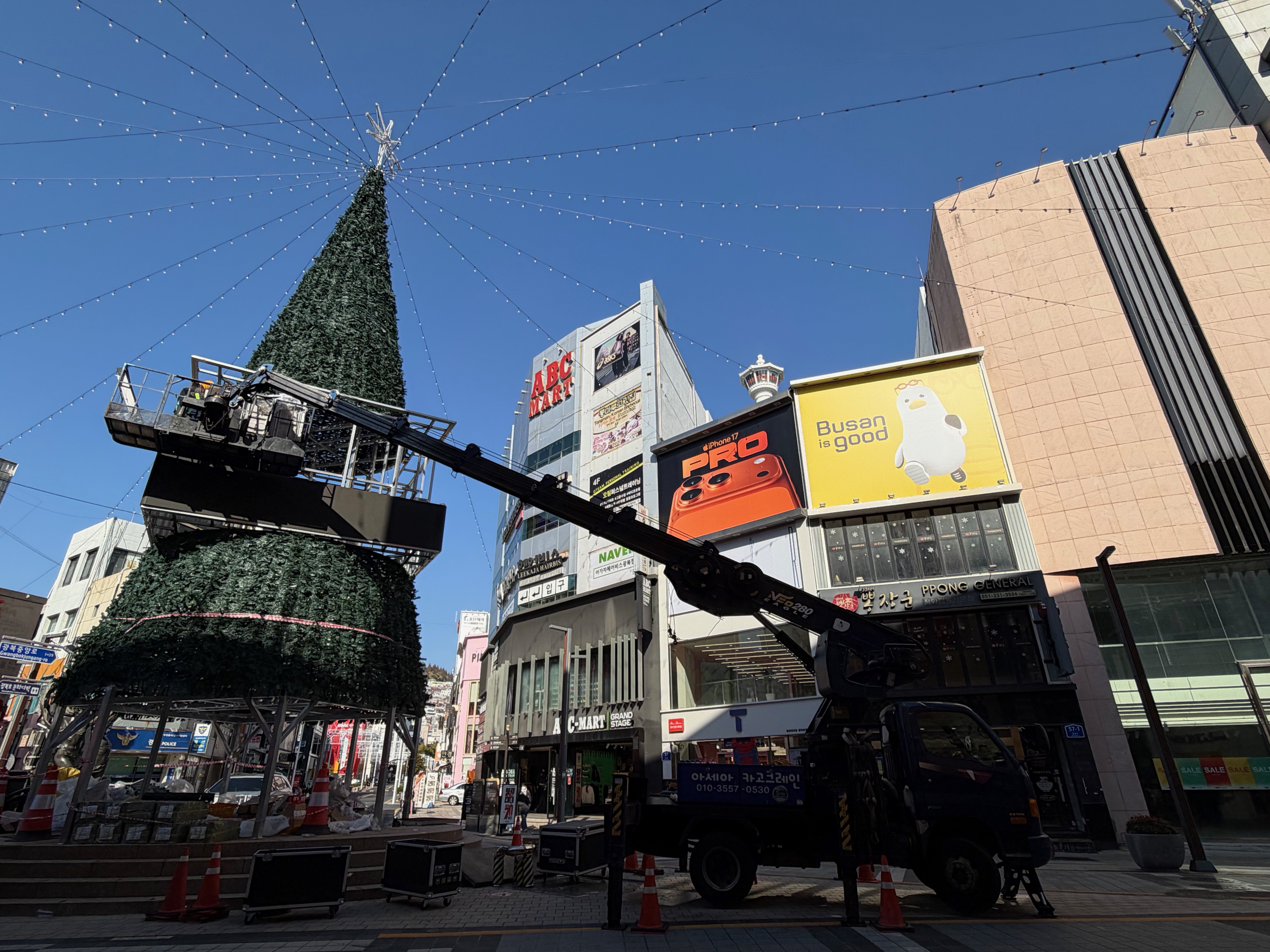 Finally, in the third video watch as the city erects a huge Christmas Tree with Busan Tower looming in the background.