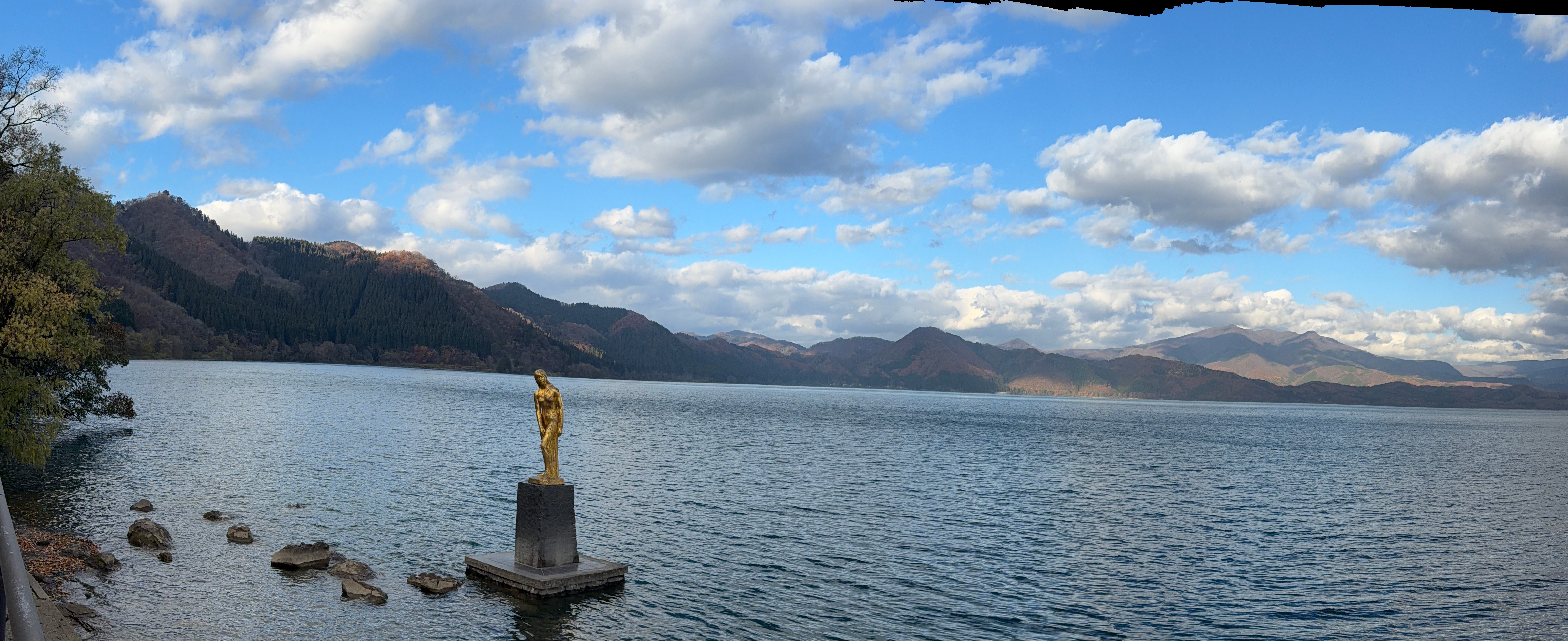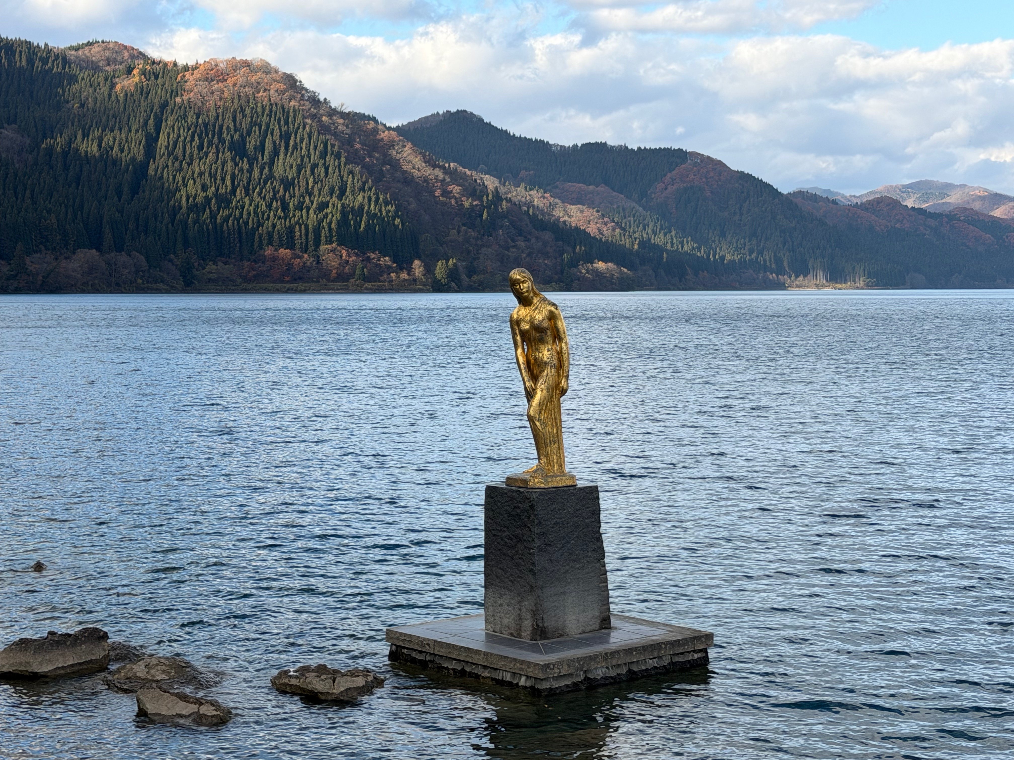 Included are views of the golden statue of the maiden Tatsuko as she stands in the lake's waters. Legend has it that she turned into a dragon when she prayed for eternal beauty. As a dragon she is forever the guardian of the lake.