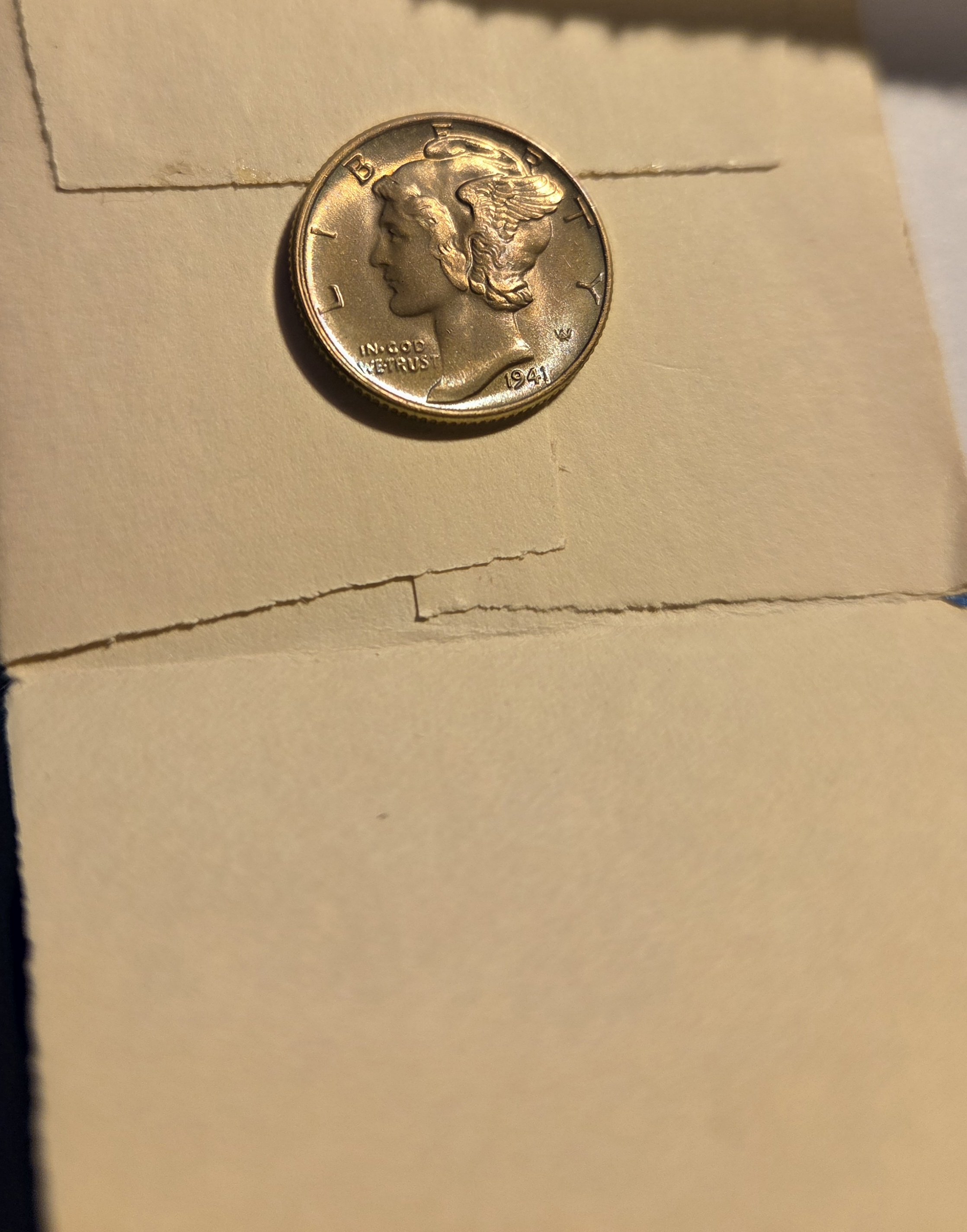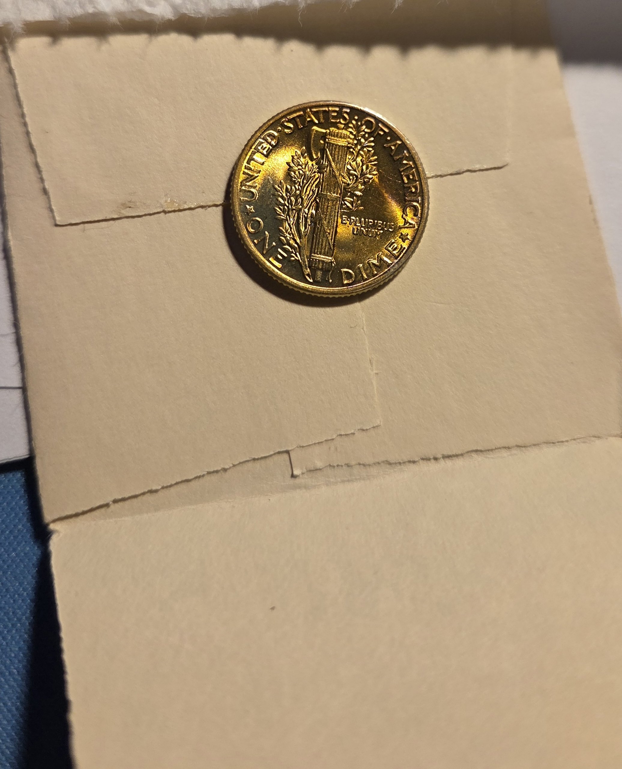 10 or so years ago, maybe longer, I purchased 6 BU Blast White Mercury Dimes. None special dates or mintmark. They all came in 2x2 paper folders. Bought them as a group for a very fair price and did not place them in my album as planned. I ran across this one today by accident, as it shouldn't have been where it was. This coin was blast white when I got it and very lustrous, which it still is. My question is I know this toned in the envelope and not planning on having it graded, but would it be questionable toning if sent in to pcgs? Just curious. I'm a terrible photographer but the reverse is bright gold in color and the obverse just a trace of blue on lower rim. It lays on the envelope it has been in.