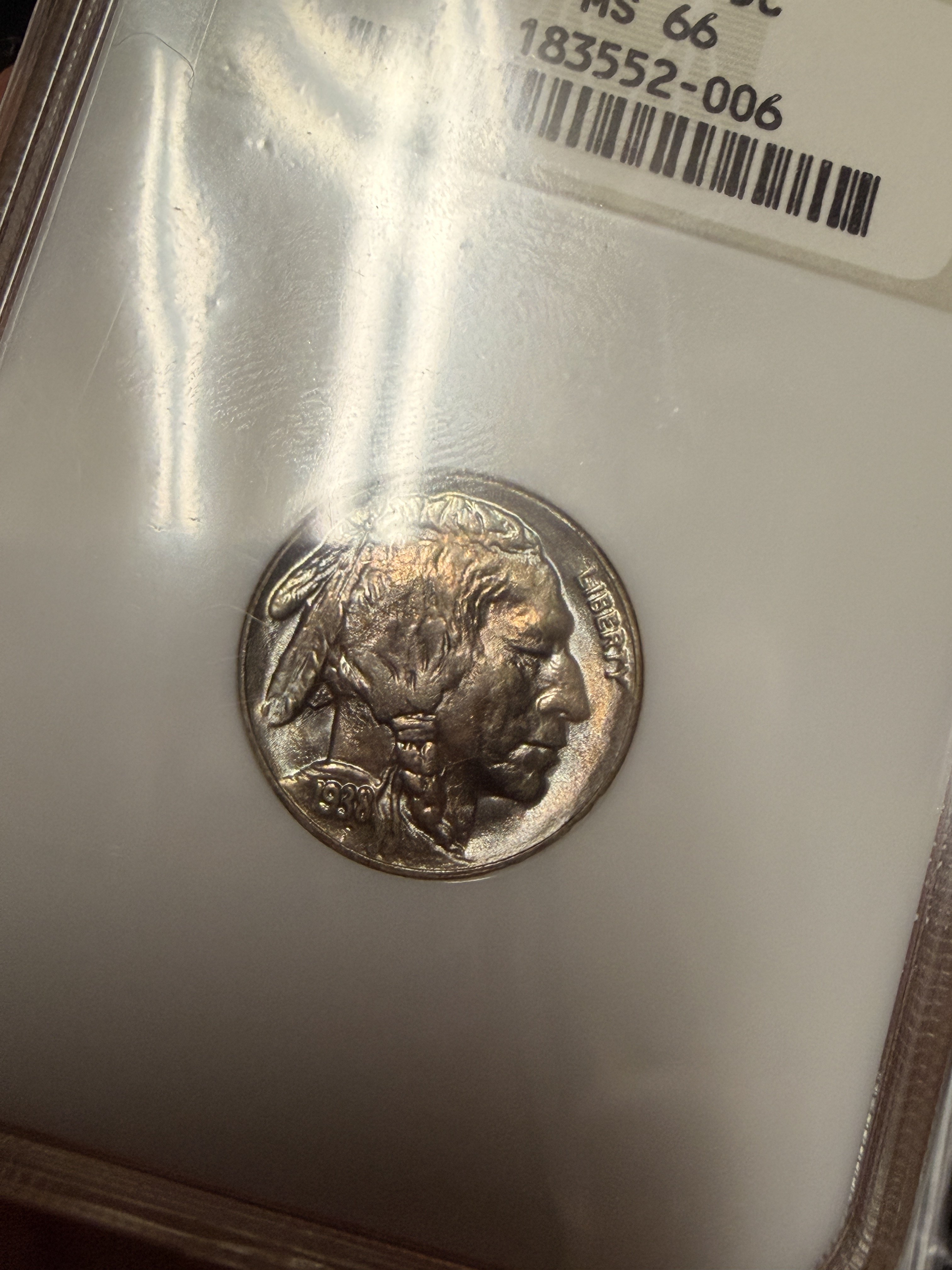 I have long admired this piece. It is the 1836 Satin Finish Proof Buffalo. This coin "don't get no respect." Collectors prefer the brilliant Proof, but to my eye this piece does a great job of show casing the Buffalo Nickel design.