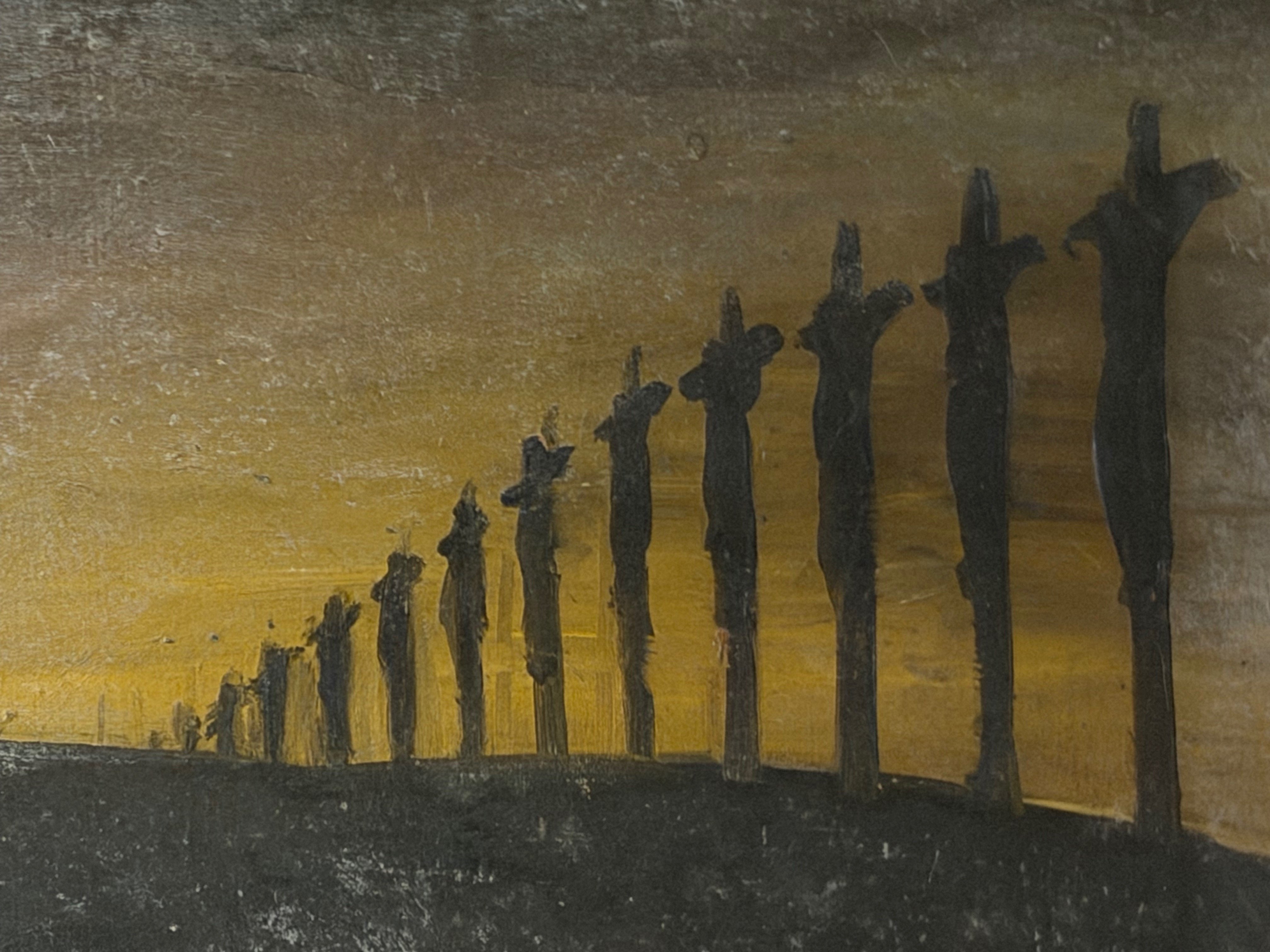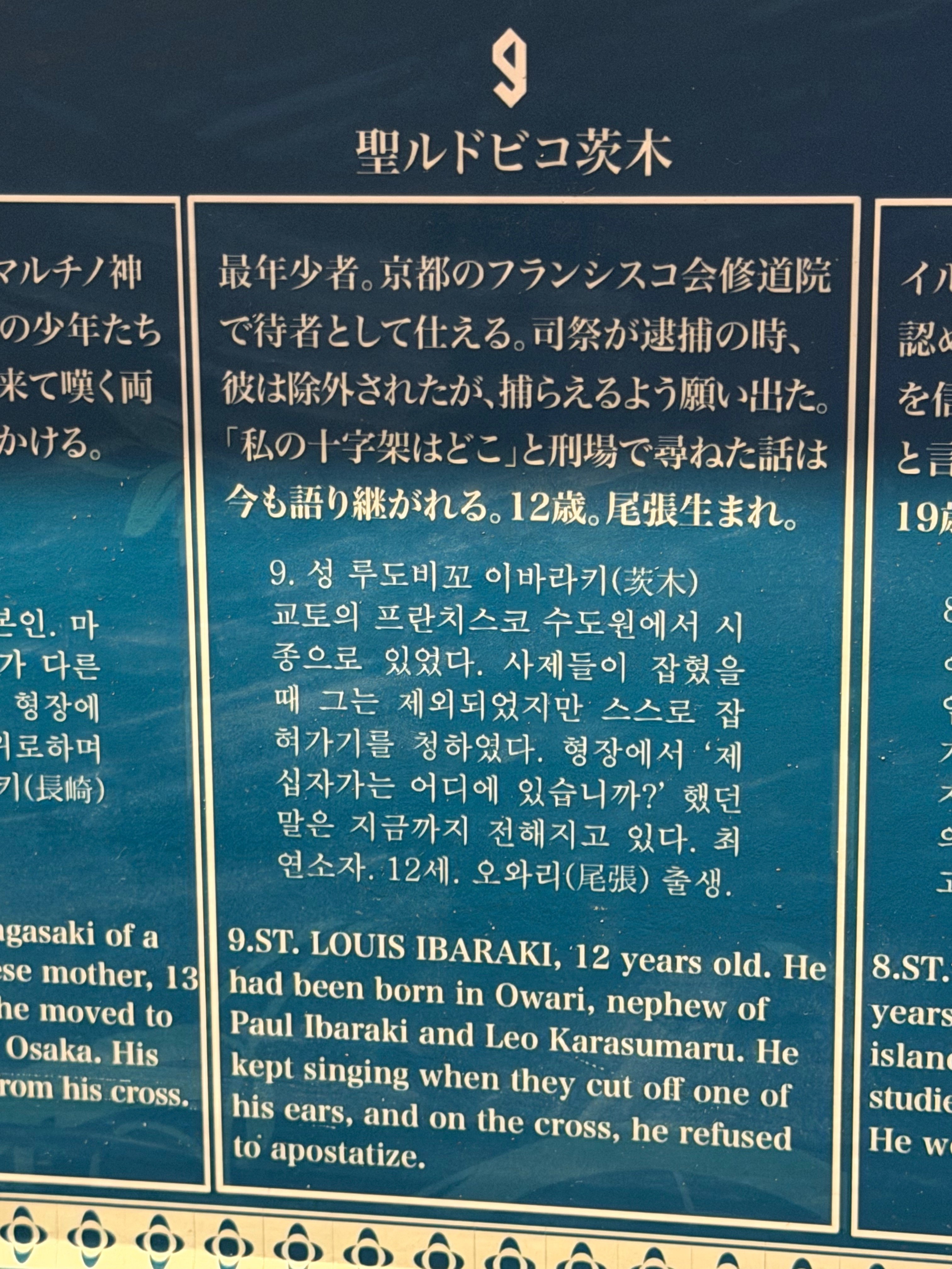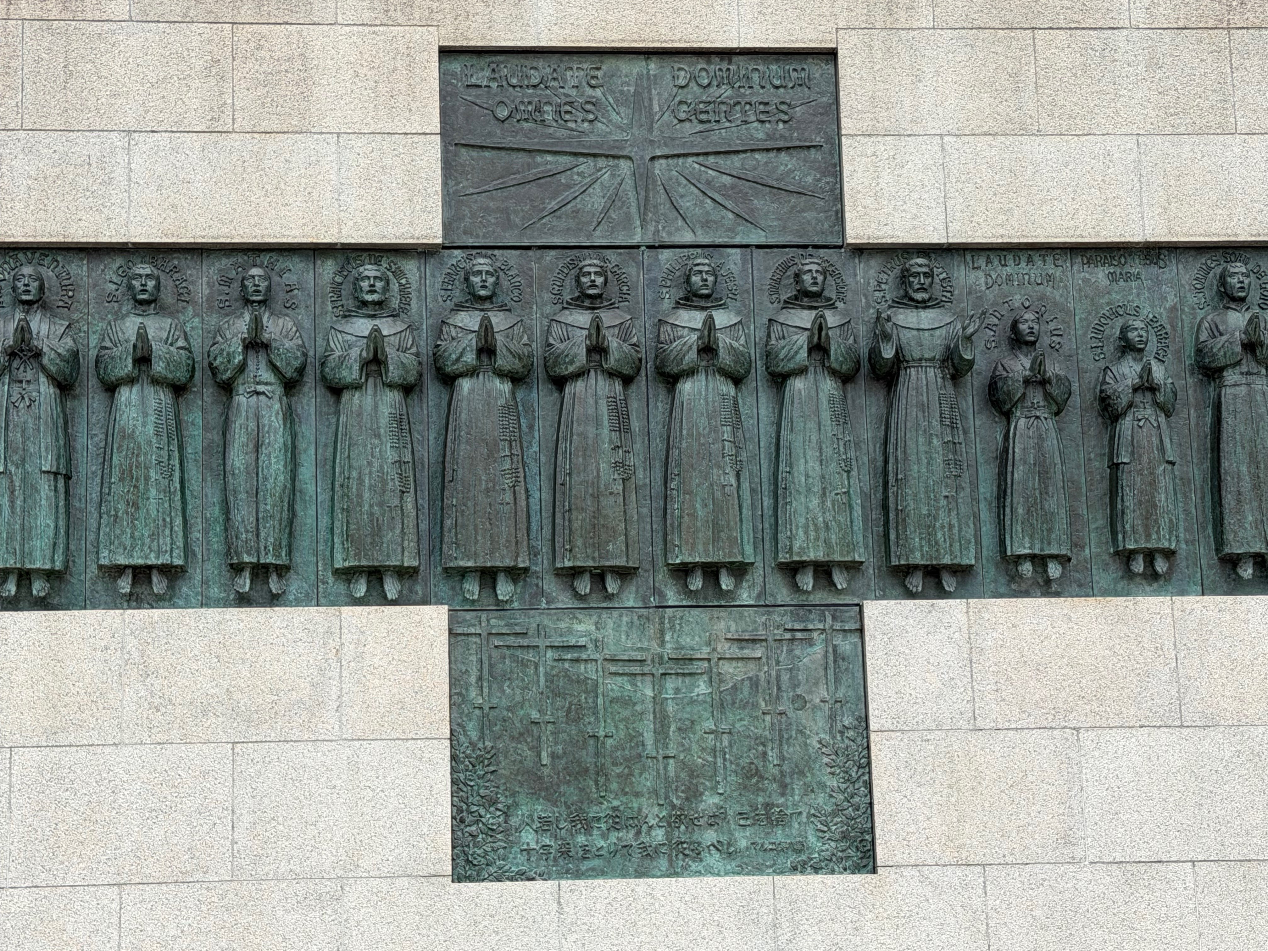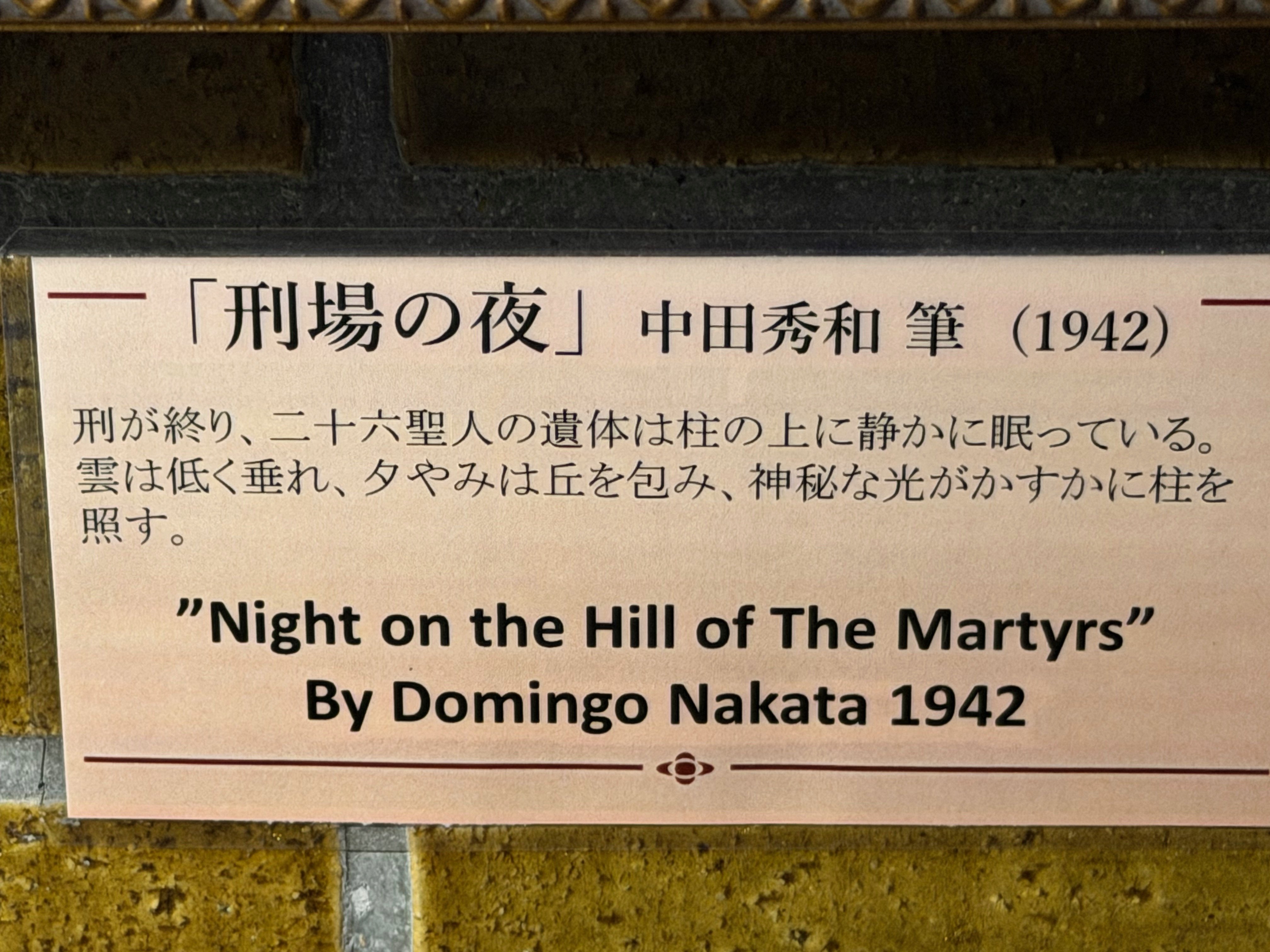 In the Twenty Six Martyrs Museum the biography of each martyr is given and provided an answer to the question of why two of the pictured martyrs on the sculpture that was erected on Nishizaki Hill has two smaller sized persons sculpted. Those two it was learned represented a 12 and 13 year old. Among the martyrs was also a 14 year old. The sculpture was erected in 1962 by Yasutake Funakoshi. In his commentary in the museum he noted that his initial intention was to have each of the martyrs looking to a single point, but then he changed it to have each look directly forward. He states he was attempting to convey their looking to Heaven and and decided the change better conveyed that image.