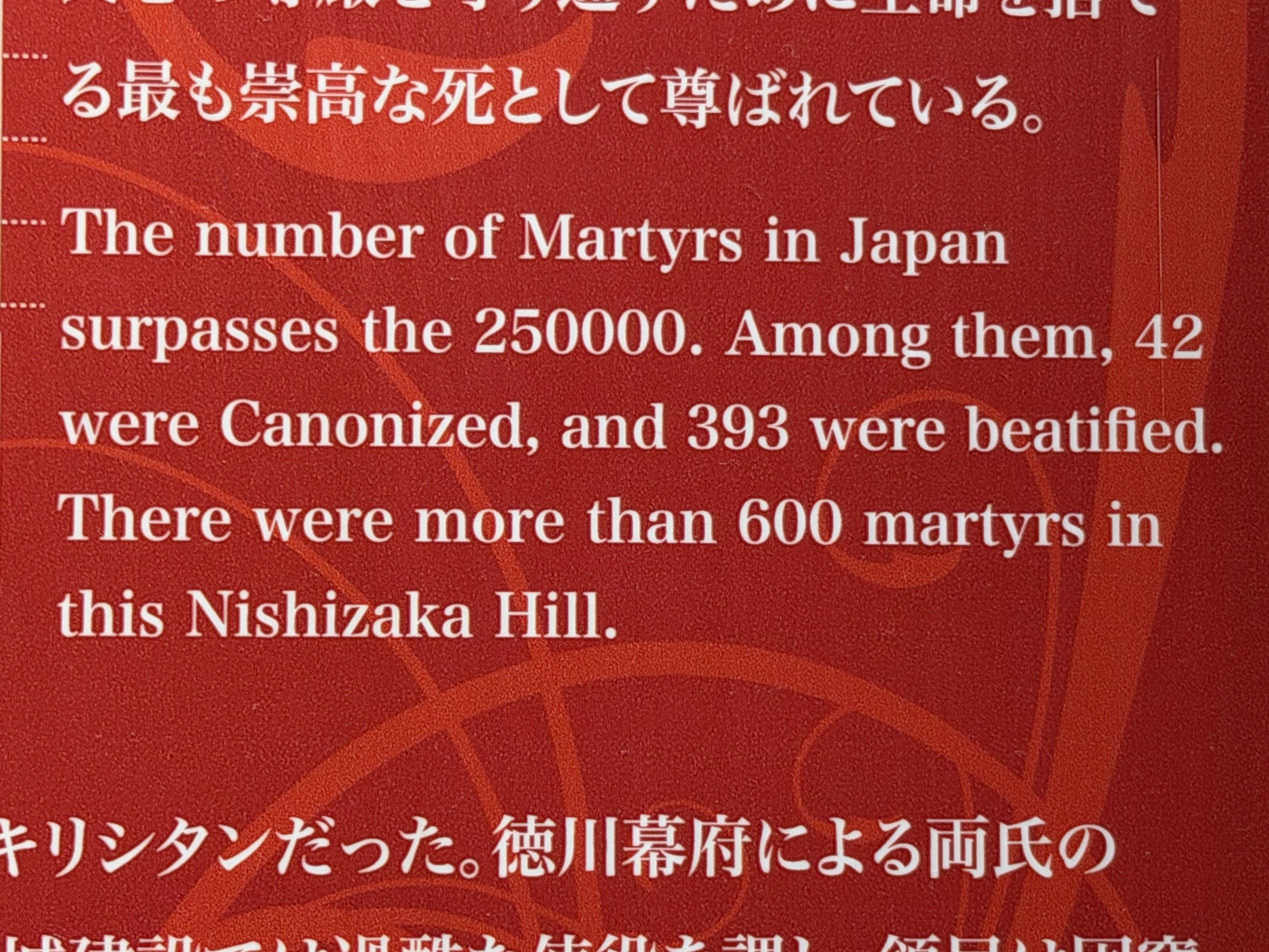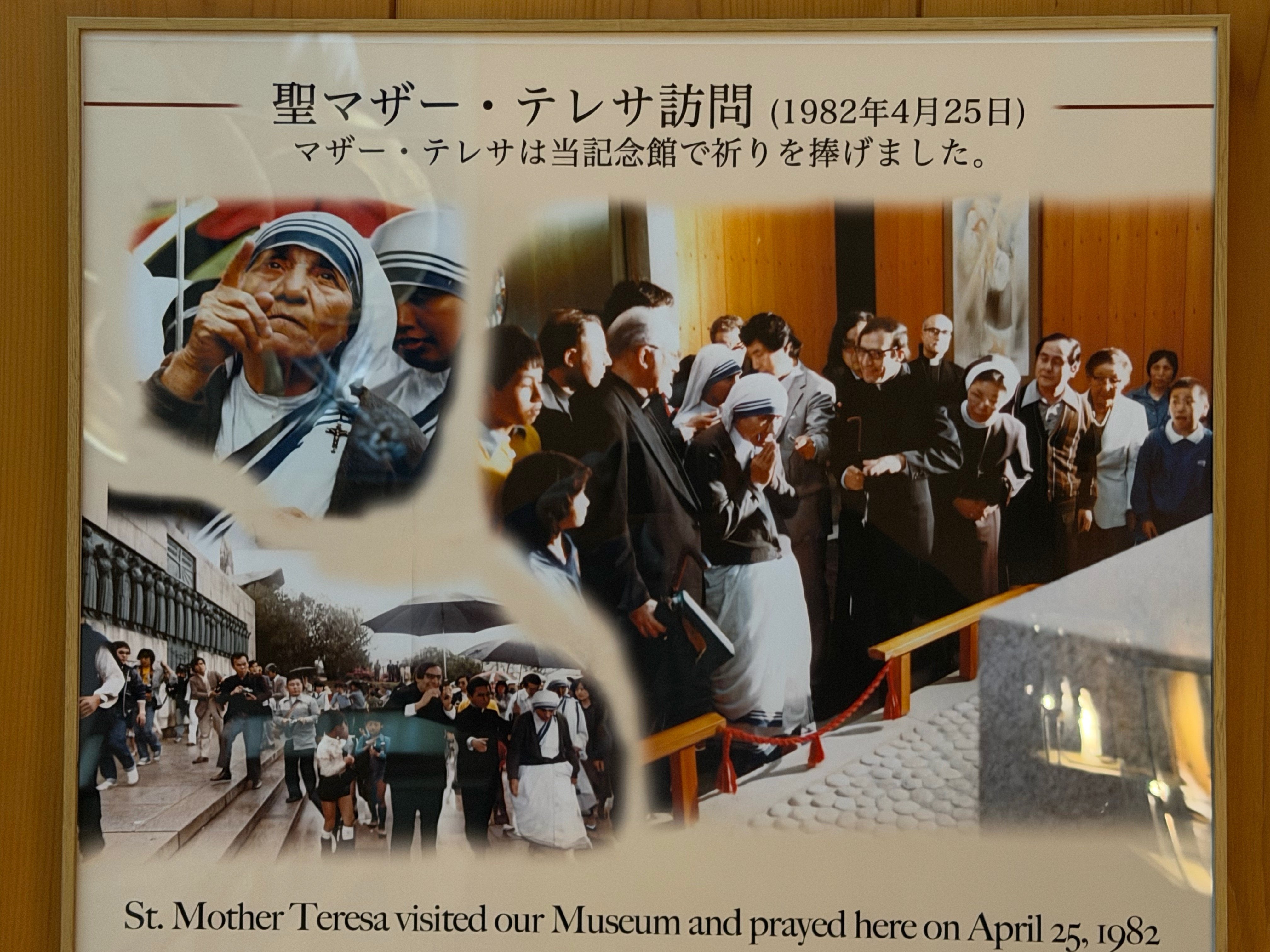 The execution of those 26 was the first of many executions of Christians to follow with a total of over 250,000, 600 of which were executed on the same Nishizaki Hill in Nagasaki. When Pope John Paul II made a pilgrimage to Nagasaki in 1981 he referred to the hill as Martyr’s Hill. In more recent years Mother Teresa also visited the hill and the museum that had been erected there. In the museum’s then built Hall of Glory her visit to the museum is commemorated by a photo of here there in the Hall of Glory.