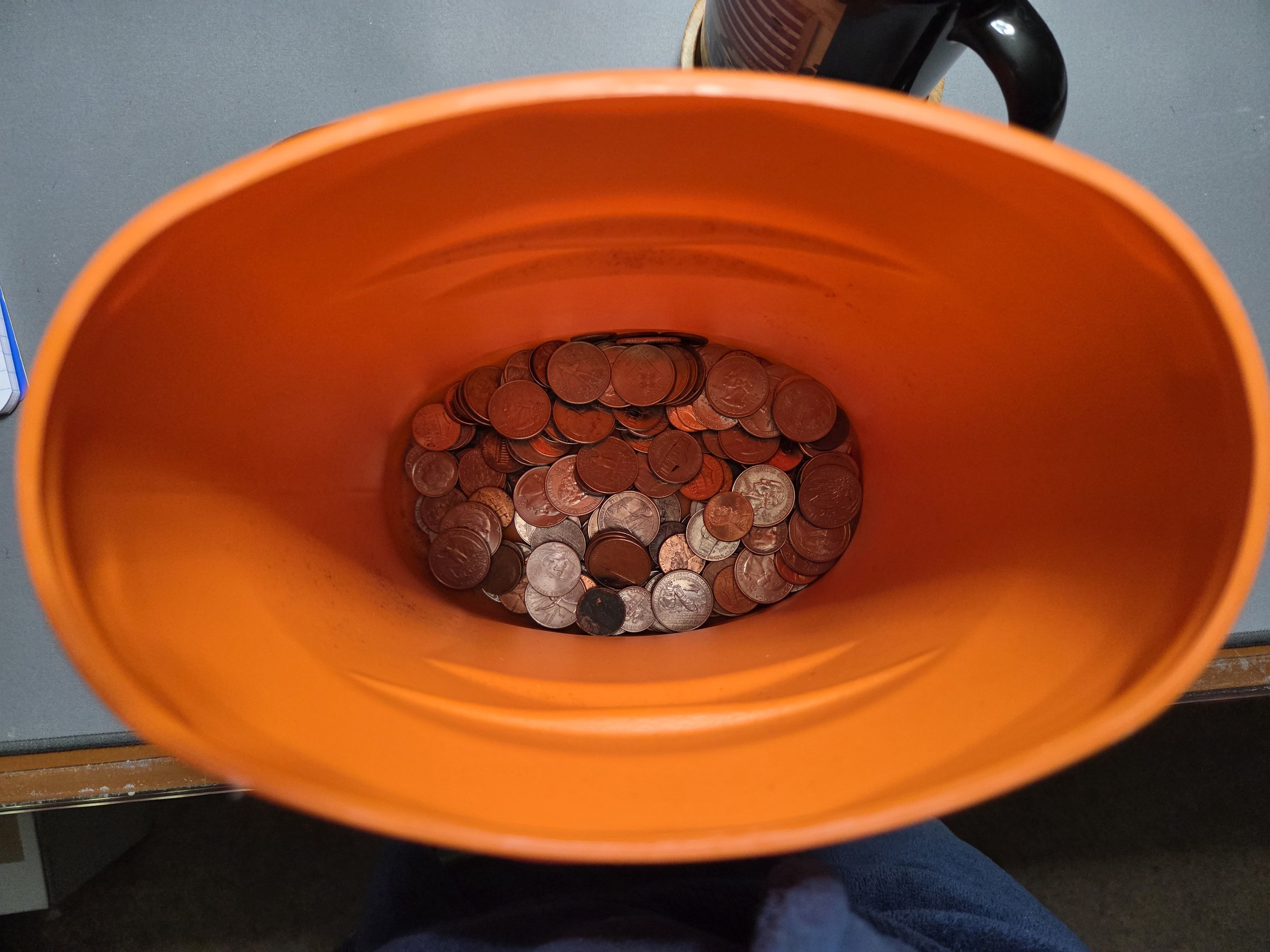 Always lift those glass jugs full of change from the bottom! I had about $400 in loose change in one, picked it up by the ring handle on top, the bottom then sheared cleanly off on a seam from the weight and dropped out, had shattered glass and change everywhere… ugh, lucky it didn’t break my foot!