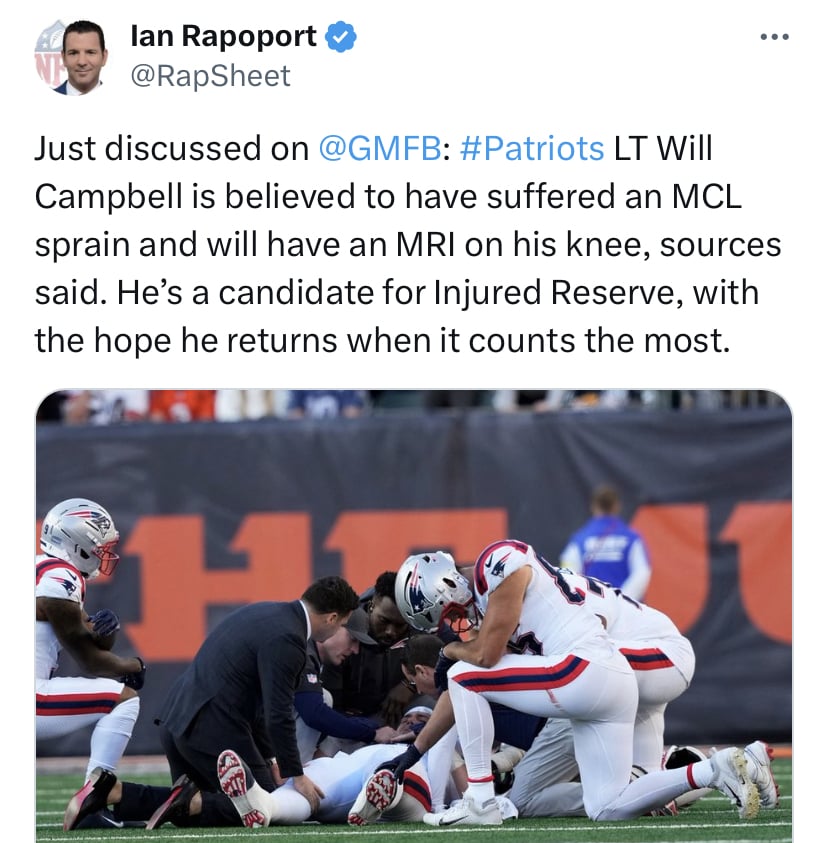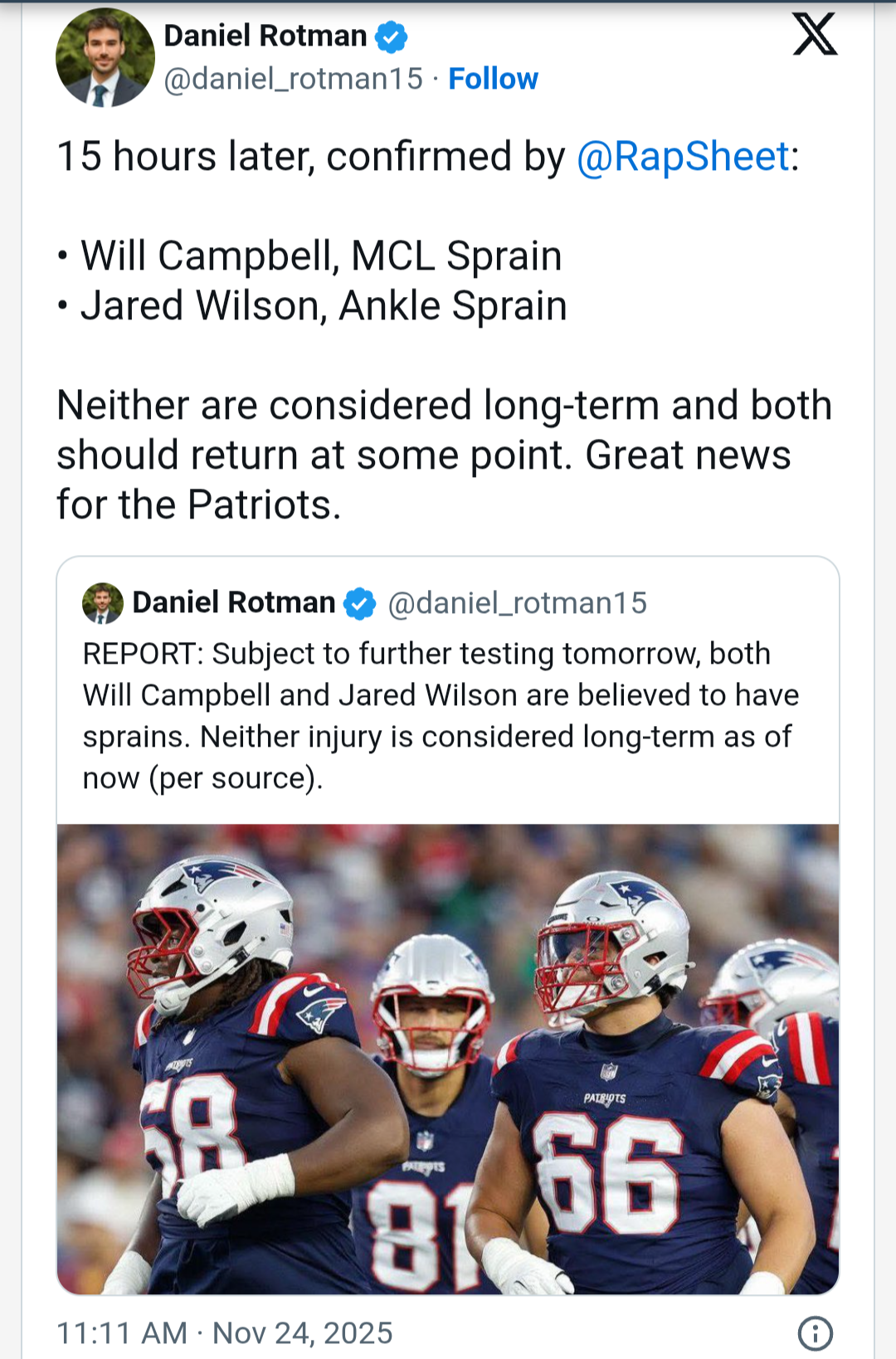 I haven’t come across any recent updates on Wilson (ankle,) Schooler (ankle) & Tonga (chest) but if they’re also going to miss time at least it happened at the most opportune time for the Pats, they’ll get an extra day of rest before the Giants on MNF and then have their bye the following week.