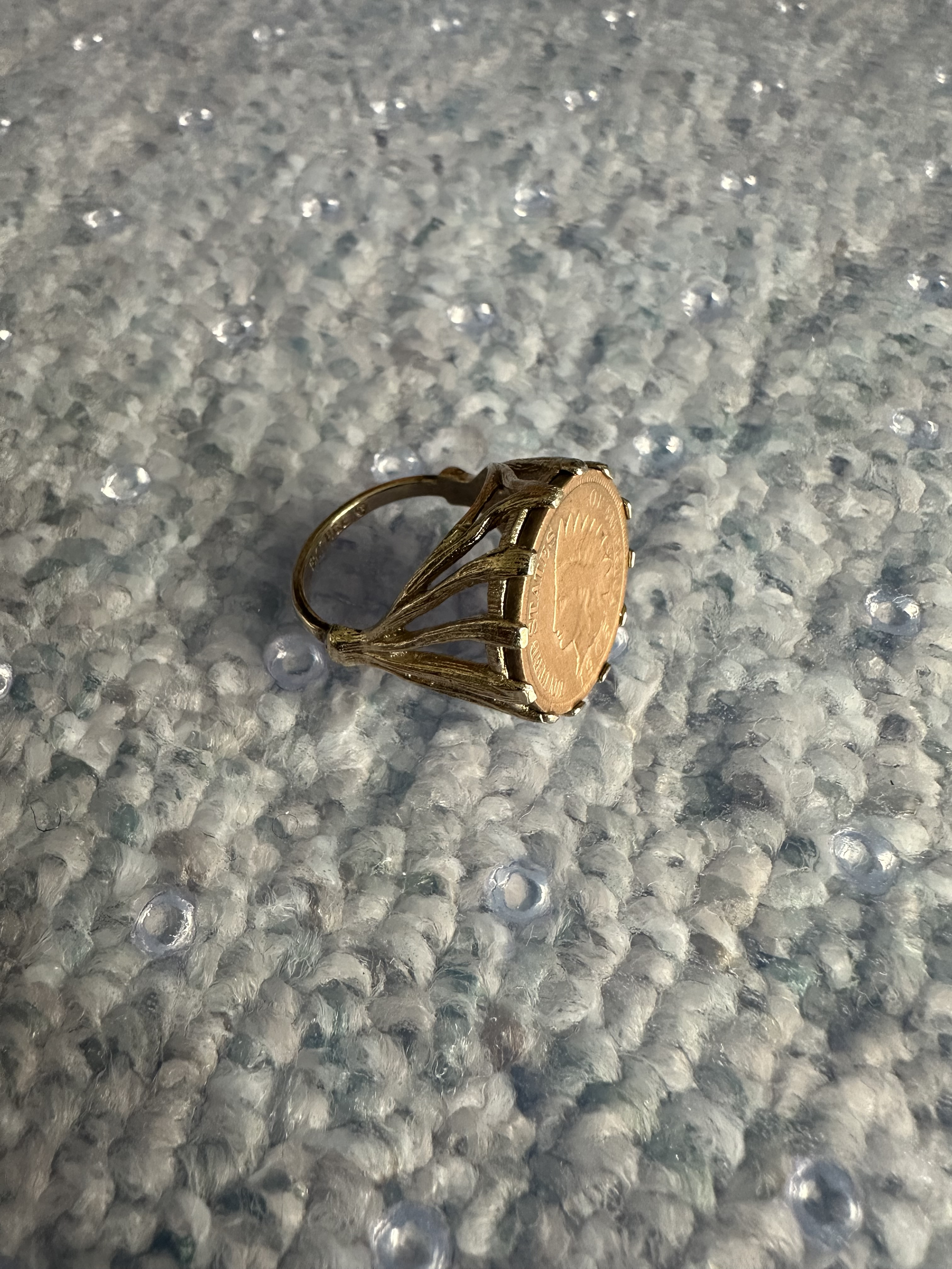 As stated already, it is not gold. The coin is worth a dollar. The ring is worth nothing. Put the ring on eBay and try to sell it for $10.00. Maybe someone will bite.
