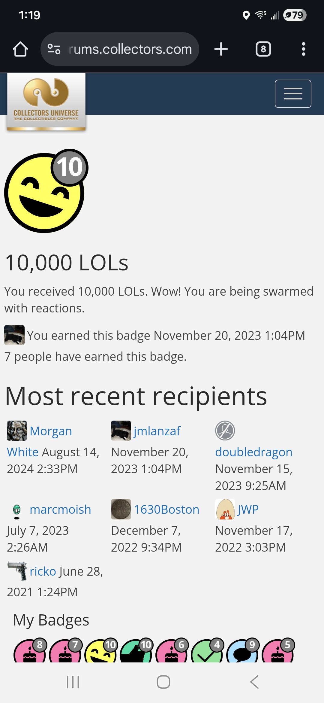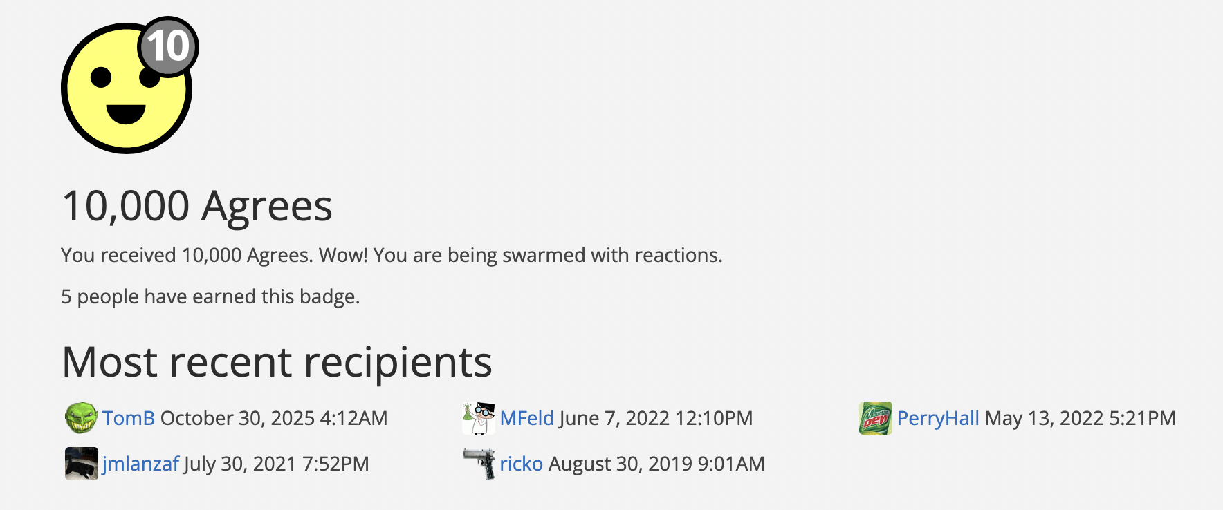I'll never get 10,000 LOLs unless folks start peppering this post like mad with them! For me, it is 10,000 Agrees with five folks total having earned it.