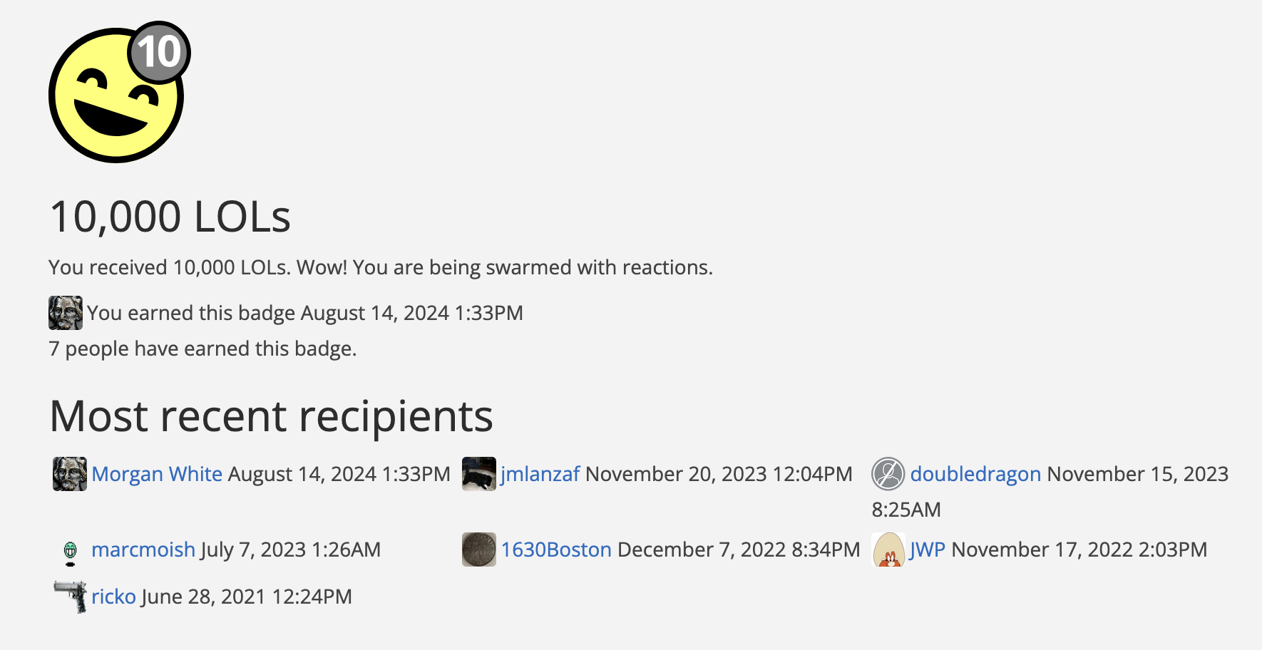The problem with that badge is you can't tell how many are for being funny and how many were meant to mock. After the disagree button went away, LOL became a way to mock a serious post.