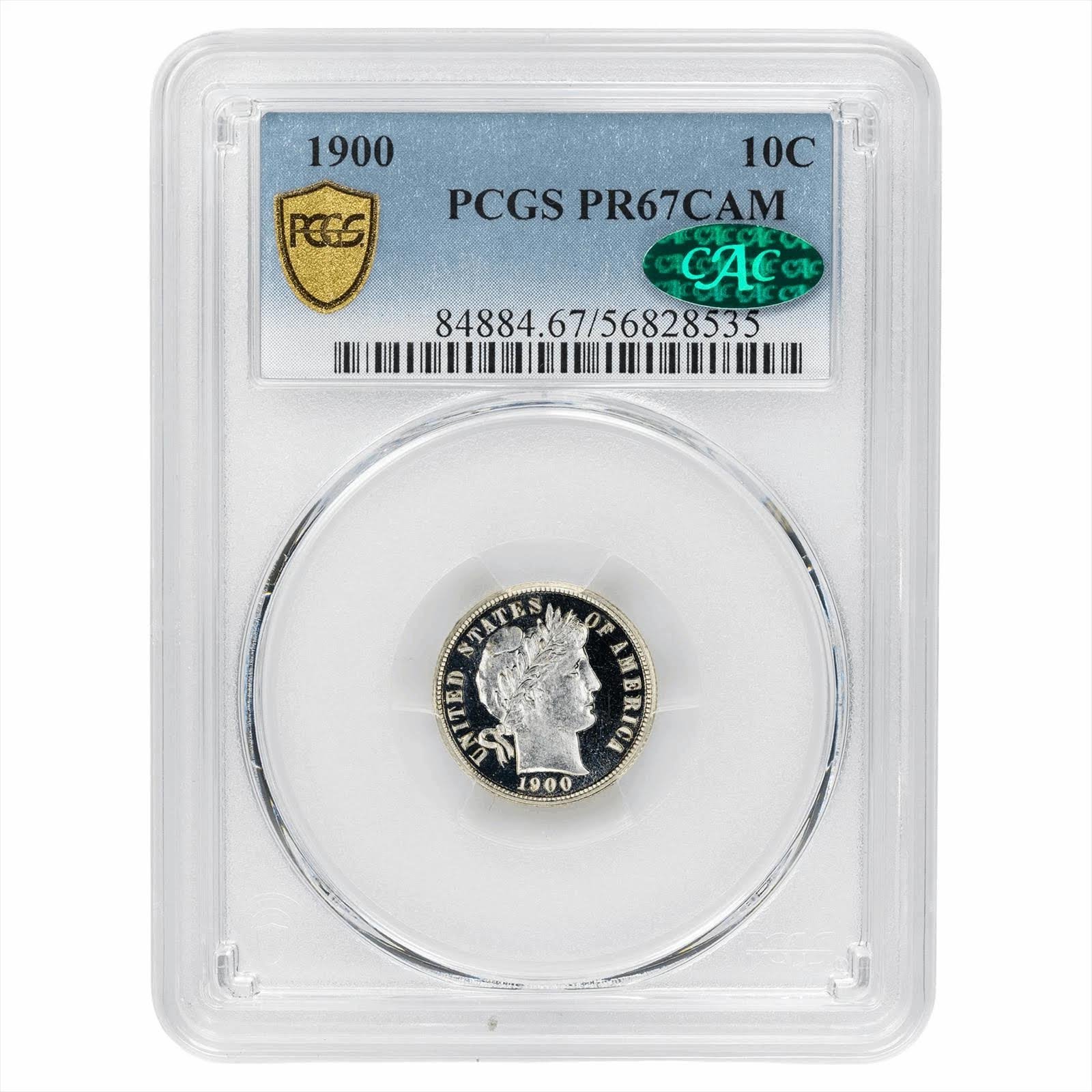 1899 10c, PCGS PR67+CAM CAC. Another gem, 1899s can be notoriously difficult to find in nice CAM condition. This example comes with extremely clean, bright surfaces and no marks noticed. Again, two die pairs appear to have been used, with this die pair more common for CAM coins over DCAM. Quality was very high, as it was for the year. This coin is no exception. CAC pop 8, 4 higher.