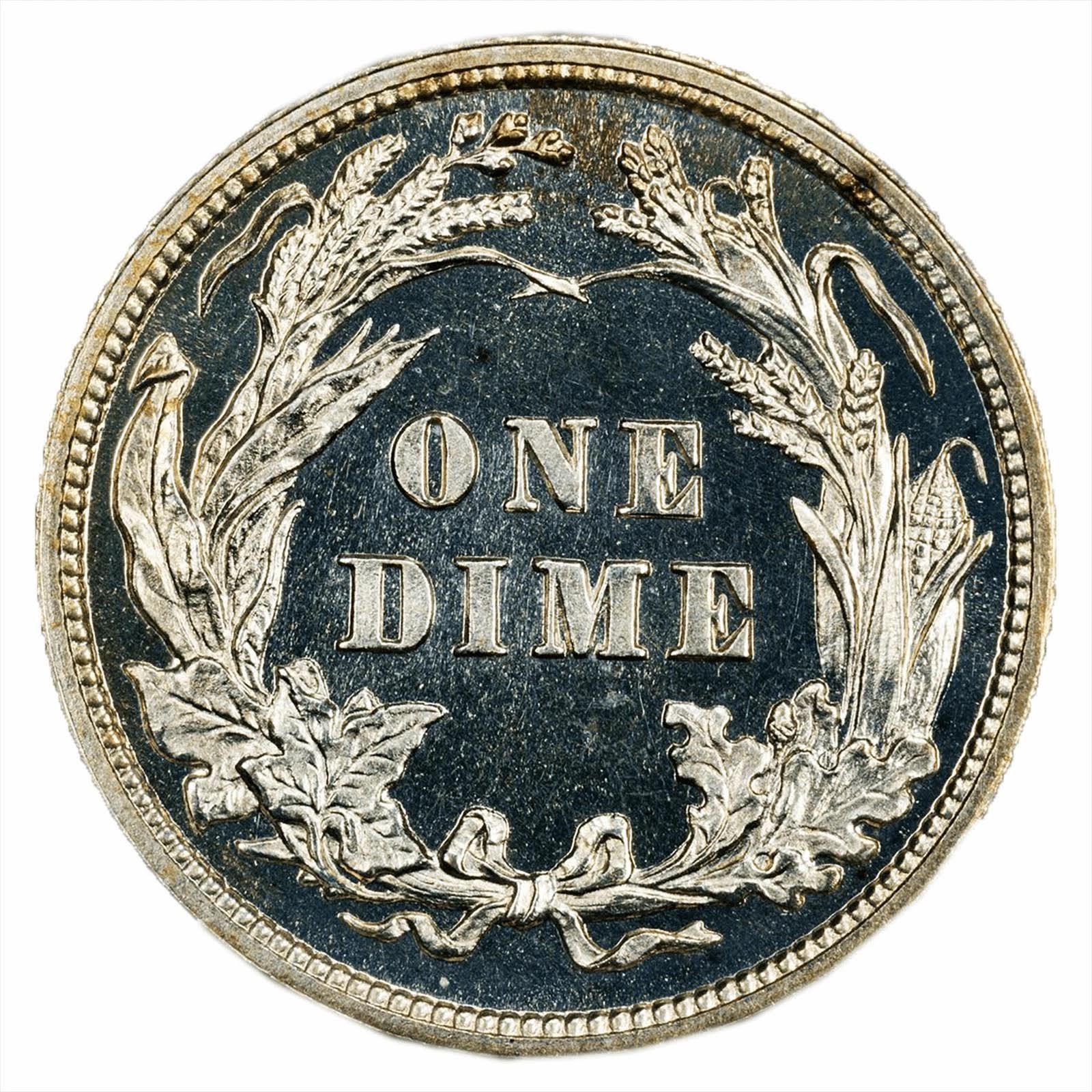 1906 10c, PCGS PR67CAM CAC. Another incredible example, with frost and mirrors leaping out at you. Very few hairlines, as is expected for the grade. The later dates of the series are increasingly difficult to find in contrasted condition, as is evidenced by the populations of coins in CAM and DCAM. Quality began decreasing since 1900, but this example is still good quality for the date, mostly due to the strong contrasts. A few frost breaks are noted on the bust, but are not distracting. CAC pop 3, 1 higher.