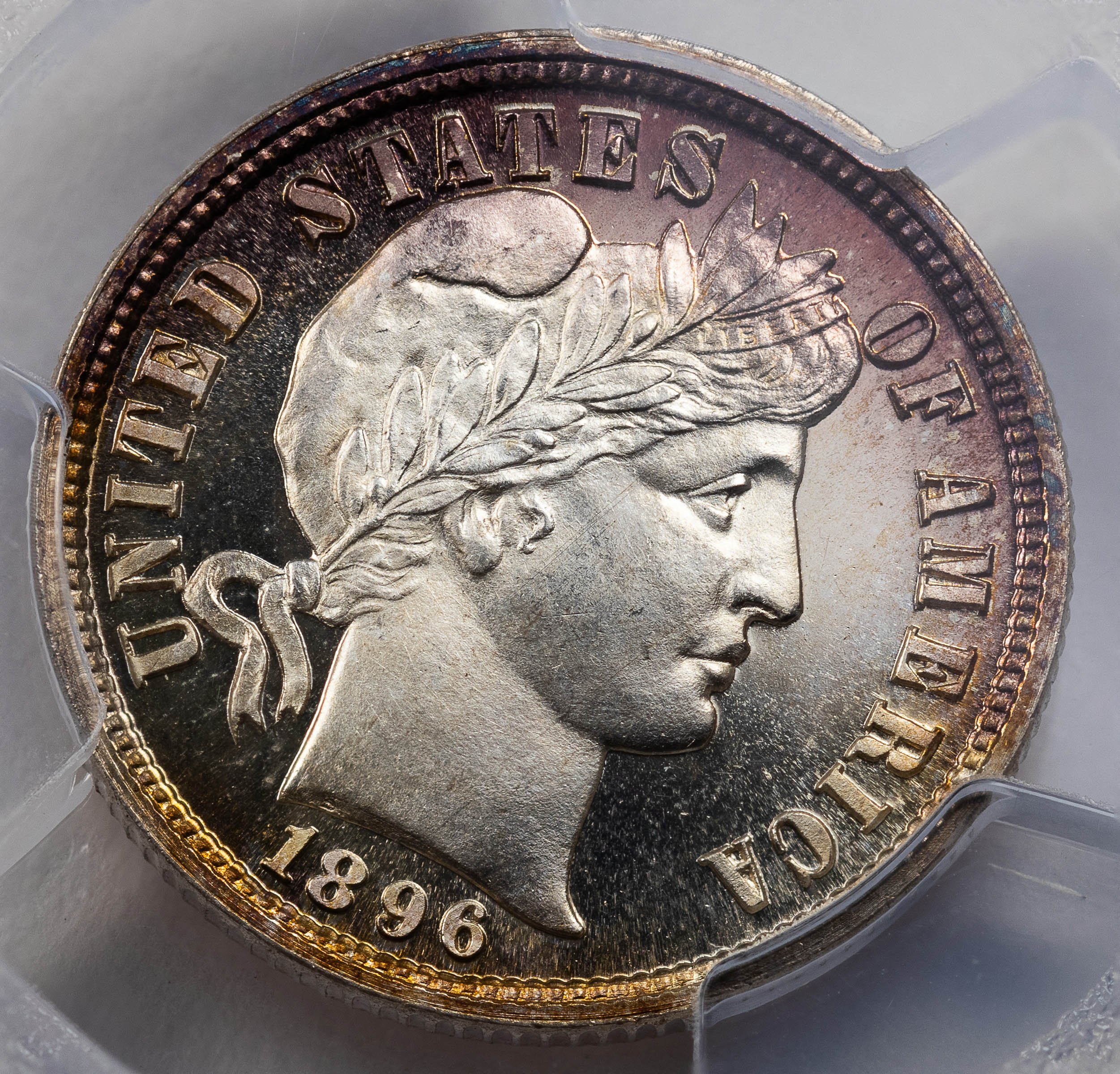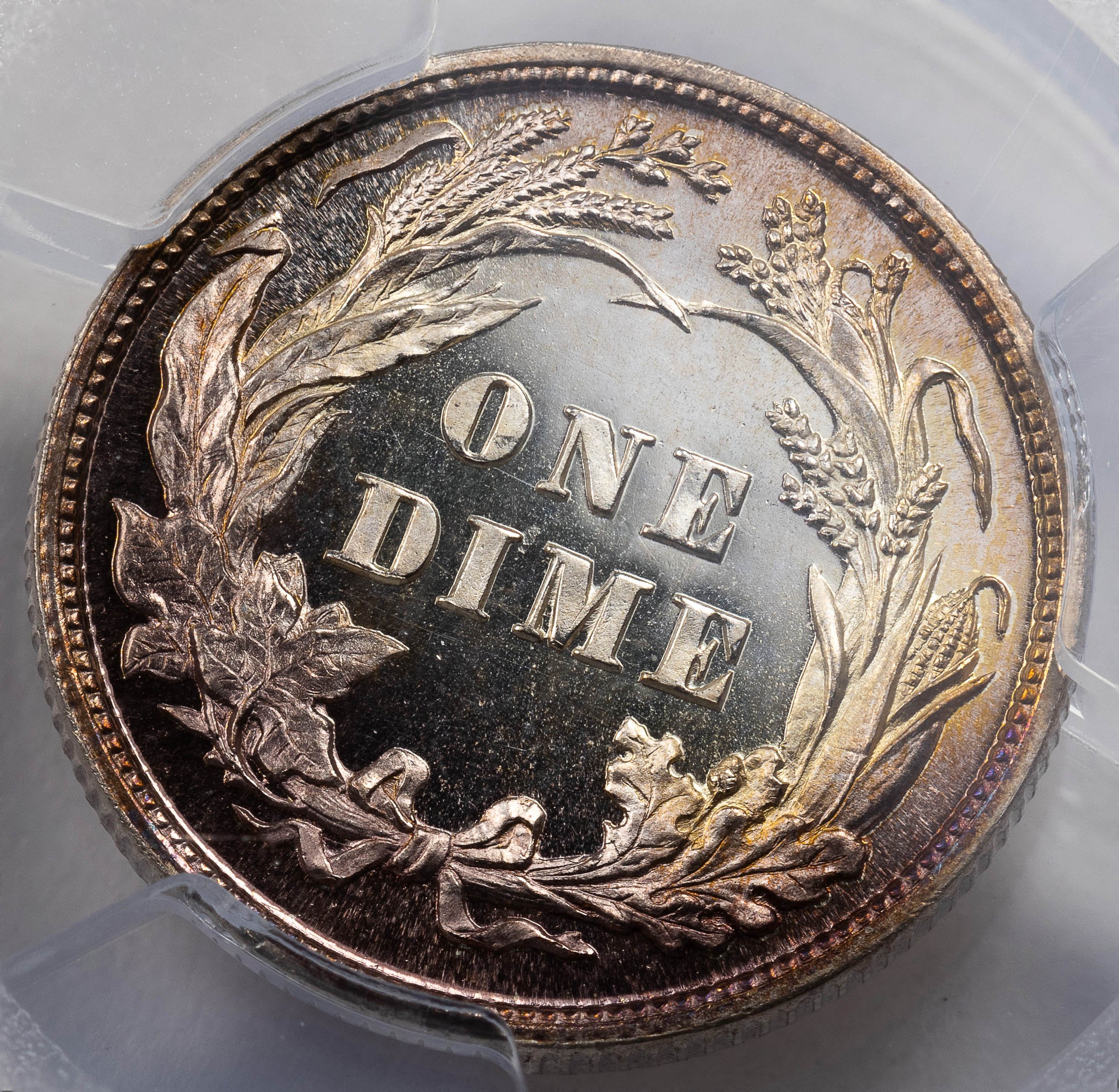1899 10c, PCGS PR67+CAM CAC. Another gem, 1899s can be notoriously difficult to find in nice CAM condition. This example comes with extremely clean, bright surfaces and no marks noticed. Again, two die pairs appear to have been used, with this die pair more common for CAM coins over DCAM. Quality was very high, as it was for the year. This coin is no exception. CAC pop 8, 4 higher.