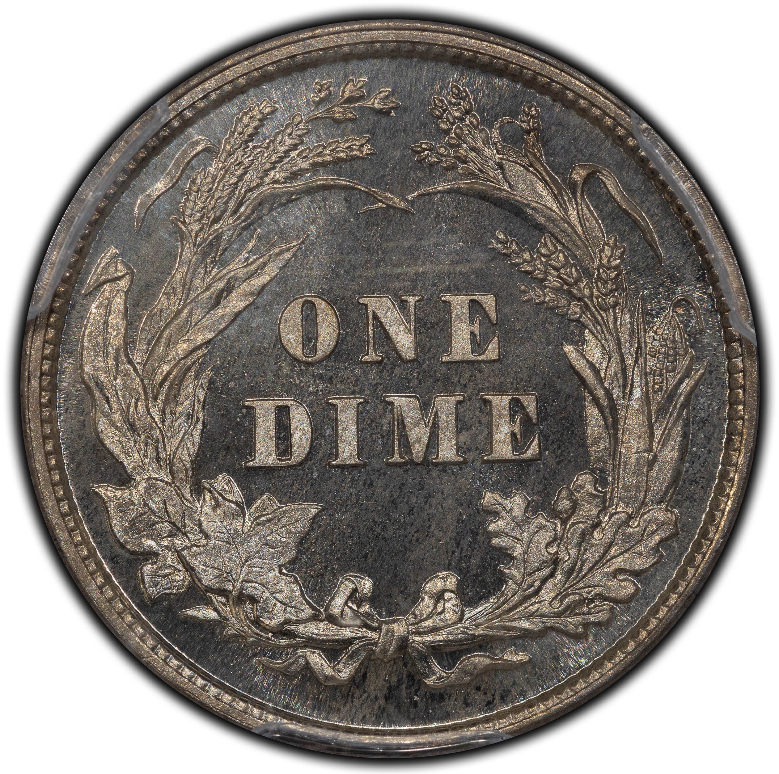 1906 10c, PCGS PR67CAM CAC. Another incredible example, with frost and mirrors leaping out at you. Very few hairlines, as is expected for the grade. The later dates of the series are increasingly difficult to find in contrasted condition, as is evidenced by the populations of coins in CAM and DCAM. Quality began decreasing since 1900, but this example is still good quality for the date, mostly due to the strong contrasts. A few frost breaks are noted on the bust, but are not distracting. CAC pop 3, 1 higher.