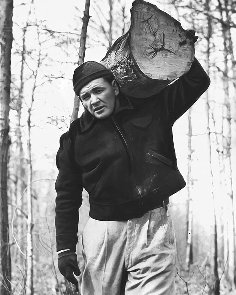 James Braddock, "The Cinderella Man", carries a log on his shoulder while training for his fight against Joe Louis in 1937.