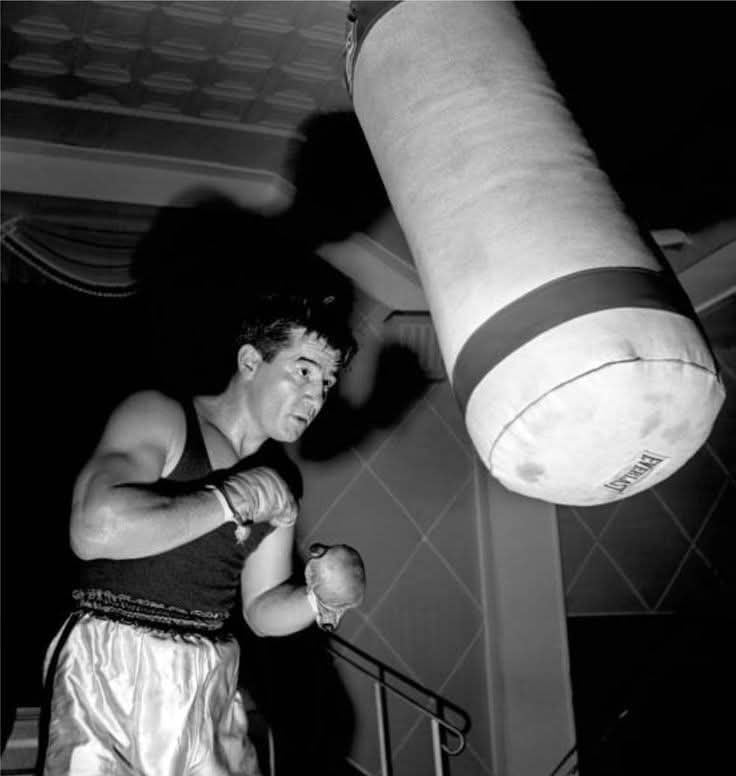 Sick photo of the murderous punching Rocky Graziano, "The Rock", pounding the heavy bag with the shadow in the background.