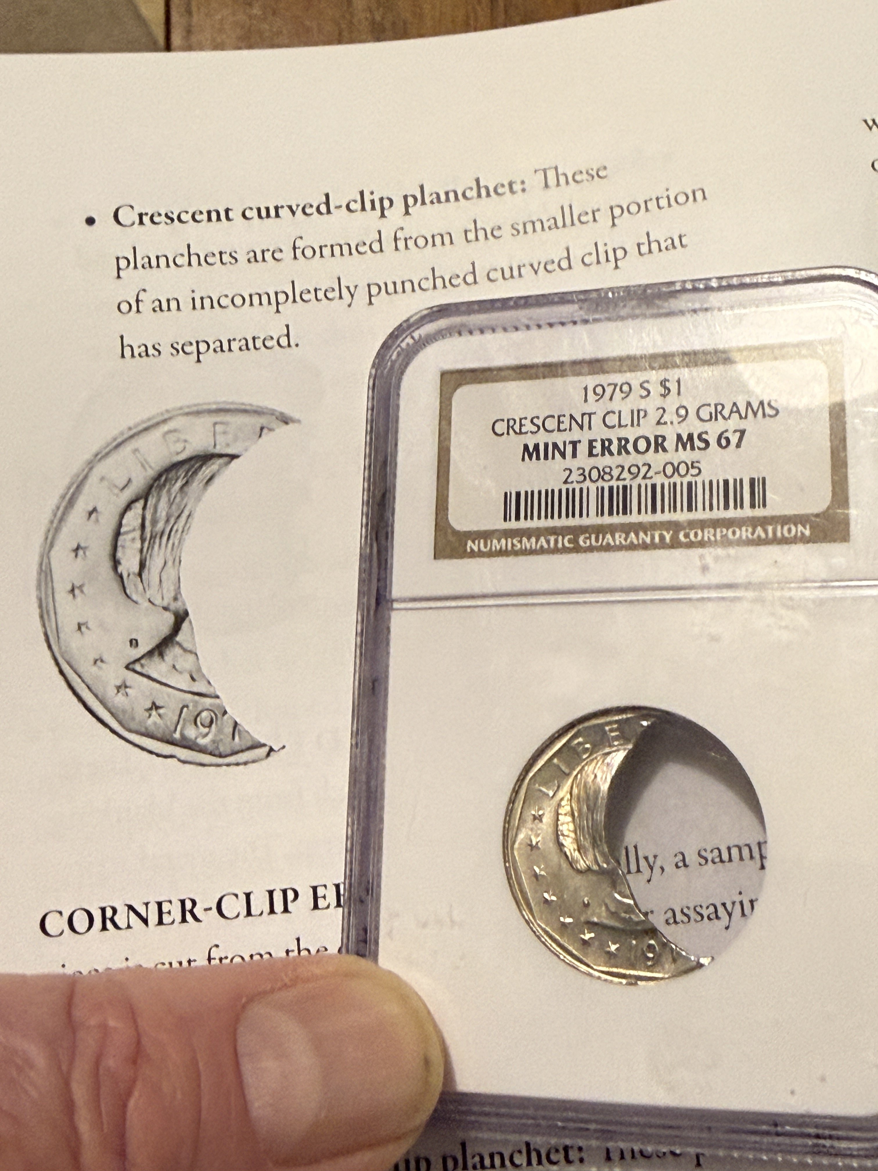 A crescent clip SBA plate coin from my error coin archive and a fire mitigated 55 foot pine tree original house owner planted 6 feet from house in 1994.