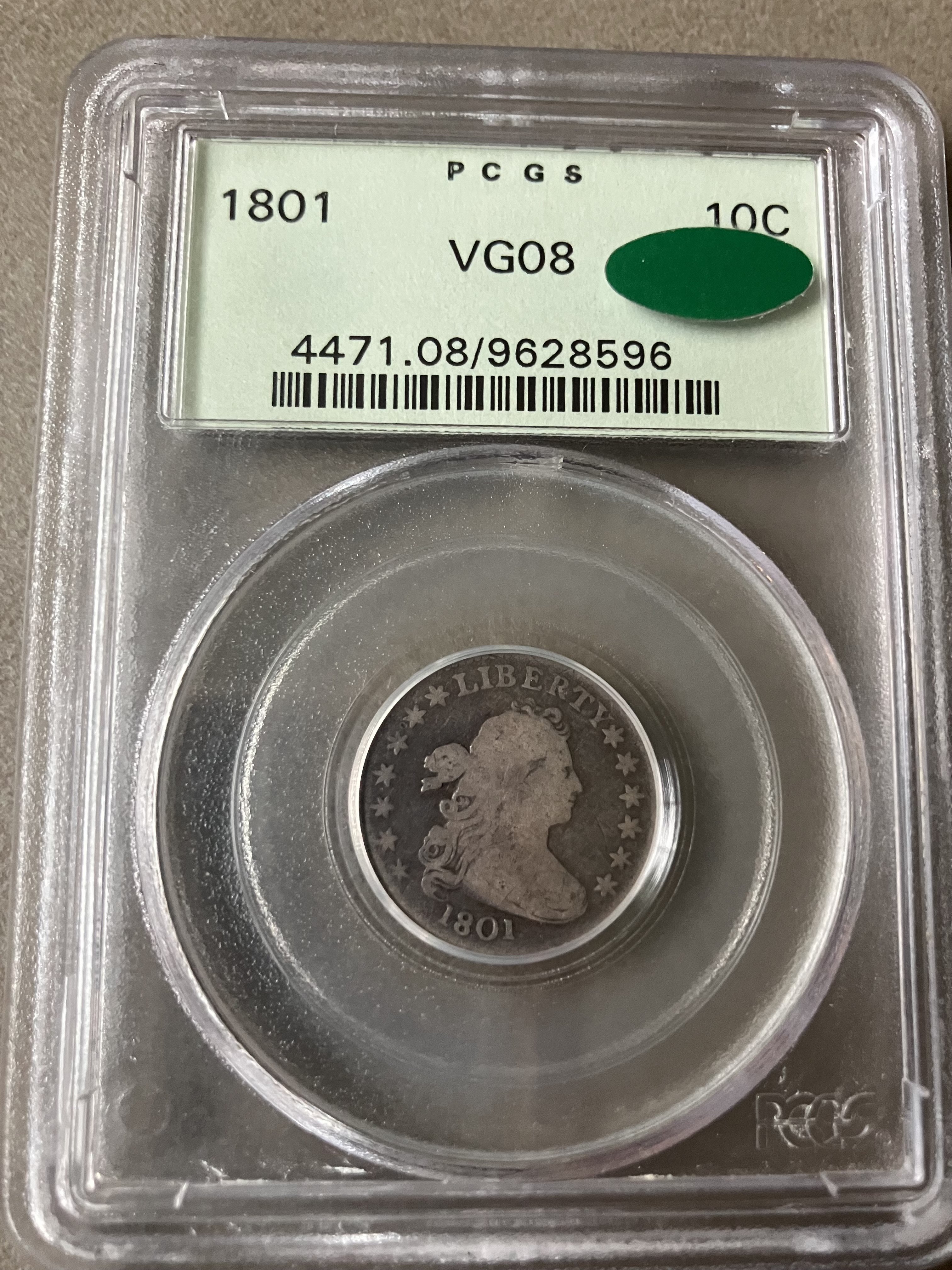 I’ll start it off with an 1801 dime, minted in the year that a lengthy and bitter electoral contest to settle the 1800 Presidential election between Thomas Jefferson and Aaron Burr was ultimately resolved on the 36th ballot (!!) by the US House of Representatives, with the election of Jefferson for his first of his two very turbulent terms in office.